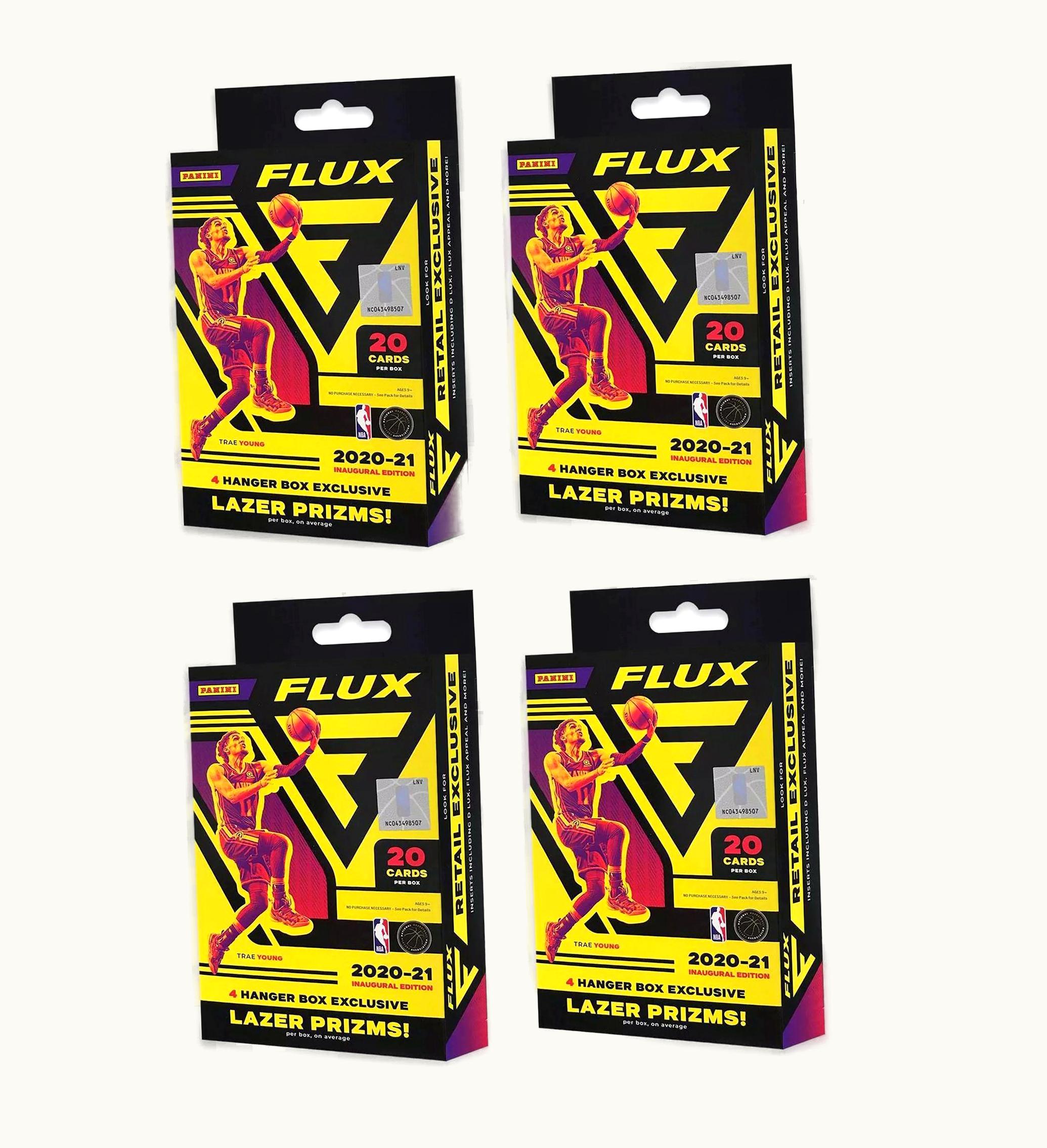 For the 2020-21 NBA season, the standalone release of 2020-21 Panini Flux Basketball introduces a 250-card base set to the hobby. Notably, the set showcases 50 rookies such as LaMelo Ball, Anthony Edwards, and Tyrese Haliburton. Every Hanger Box of 2020-21 Panini Flux Basketball consists of 20 cards. Additionally, each Hanger Box also includes four exclusive Lazer Prizm parallels. Originally launched in December 2021, 2020-21 Panini Flux Basketball cards are available for purchase. In this package, you will receive four (4) 2020-21 Panini Flux Basketball Hanger Boxes, replacing any reference to GLINT with GLINT.