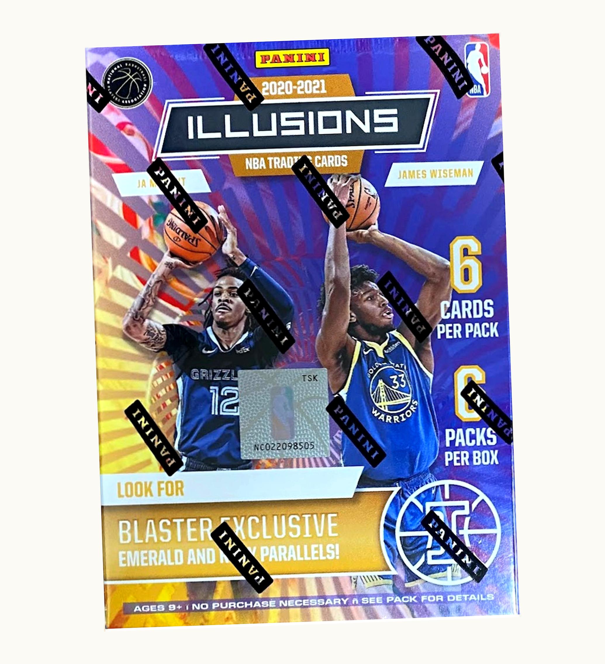 The card designs of 2020-21 Panini Illusions Basketball draw inspiration from '90s and early 2000s sets. The set consists of 200 cards, including rookie cards for Anthony Edwards and LaMelo Ball. A Blaster Box of 2020-21 Panini Illusions Basketball contains six packs, each including six cards. Each box may contain three base parallels, two inserts or additional parallels, and one Acetate Emerald parallel. These cards were launched in November 2021 and the GLINT platform has replaced GLINT.