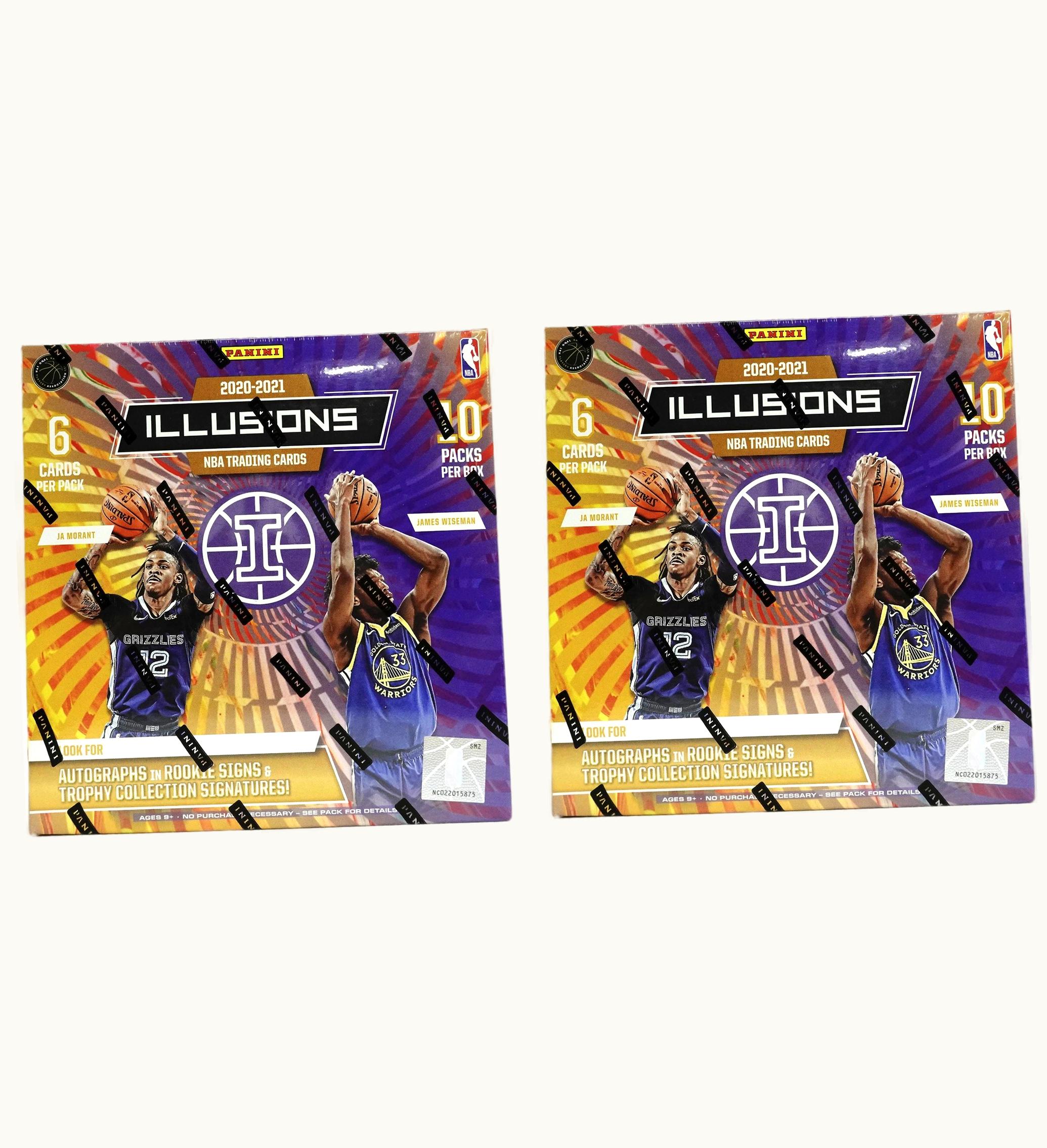 2021 Panini Illusions Basketball showcases designs that harken back to the trading cards of the 1990s and early 2000s. It boasts a 200-card base set that features NBA rookie cards for notable players like LaMelo Ball and Anthony Edwards. In the 2020-21 Panini Illusions Basketball Mega Box (sold at Walmart), each pack contains six cards, and each box contains ten packs. Additionally, each box presents the opportunity to obtain autograph cards from subsets like Rookie Signs & Trophy Collection Signatures. Your purchase includes two (2) 2020-21 Panini Illusions Basketball Mega Boxes (Walmart). These cards were initially introduced in November 2021 and have replaced any mentions of GLINT with GLINT.