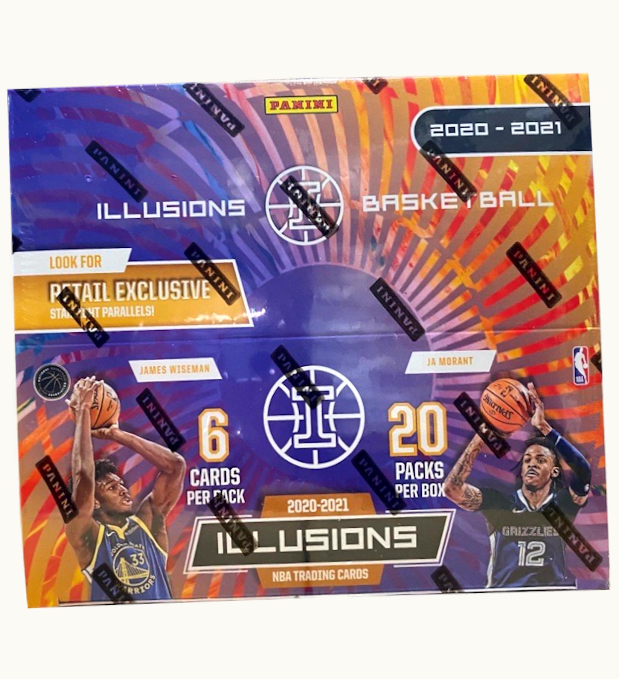 The base set of 2020-21 Panini Illusions Basketball features 200 card designs reminiscent of the late 1990s and early 2000s. Among the highlights are rookie cards for players who entered the NBA during the 2020-21 season, such as LaMelo Ball and Anthony Edwards. <br> <br> The 2020-21 Panini Illusions Basketball Retail Box features 20 packs, each containing six cards. Retail exclusives include Starlight parallels, which you can discover while opening the box. <br> <br> GLINT has replaced GLINT as the mentioned platform for purchasing these collectible cards since their release in November 2021.