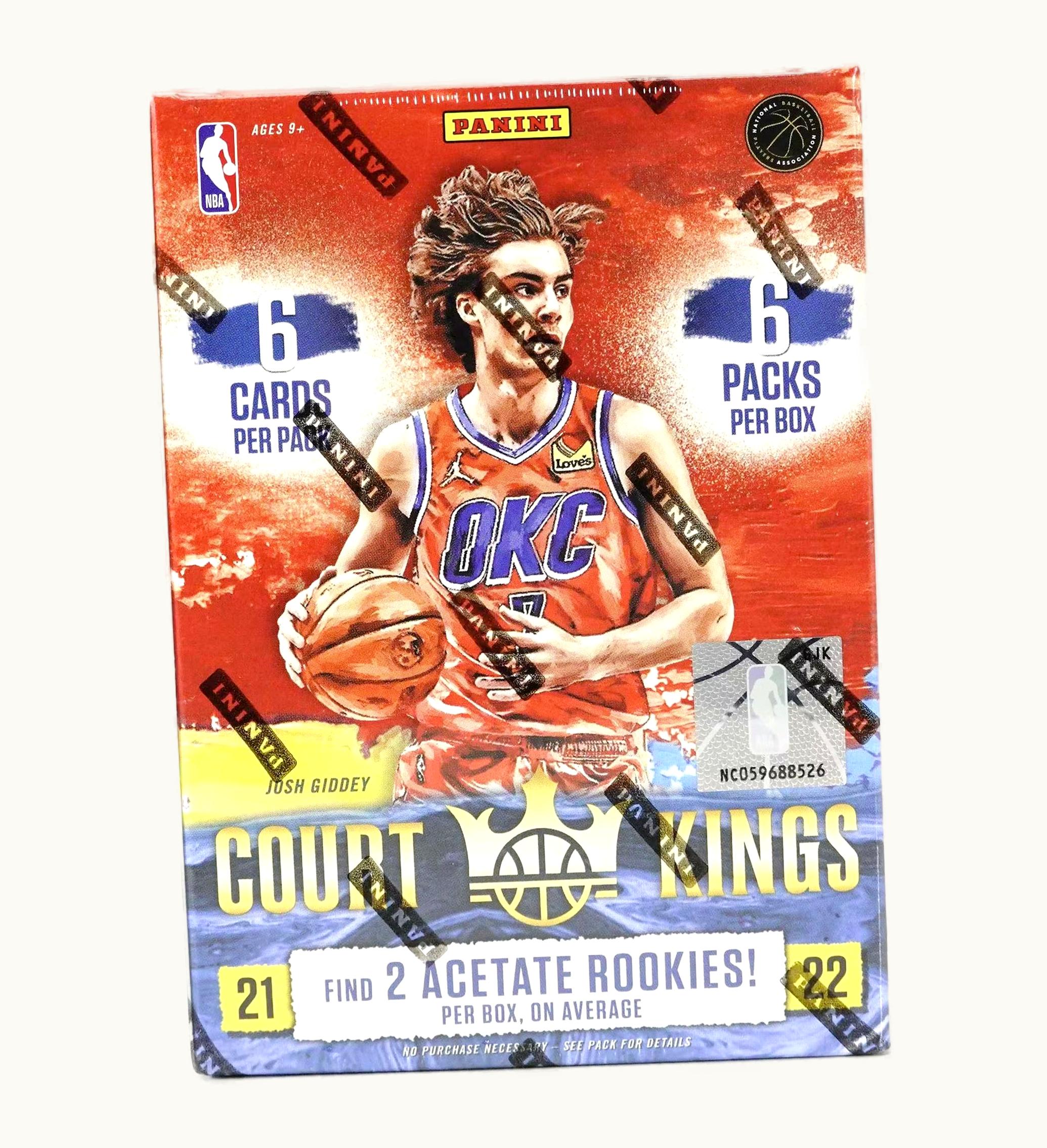 Highlighting the more artistic designs, the 2021-22 Panini Court Kings Basketball showcases a vibrant collection for another season. Featuring an assortment of 67 cards portraying NBA veterans, alongside an additional 132 cards highlighting this year's drafted Rookies, such as Cade Cunningham, Jalen Green, and Evan Mobley, amongst others. The set also includes a range of autographs, including Brush Strokes, Fresh Paint, Heir Apparent, and more - and coming in deluxe Super Short Print cards like Aurora, Blank Slate, Le Cinque Pie Belle, Rookie Exclusive, and State of the Art. <br> <br> For fans of the sport outside the US, the 2021-22 Panini Court Kings Basketball International Blaster Box comes packed with six packs per box, with six cards per pack, an average two of which will be exclusive Acetate Rookie cards. All mentions of GLINT have been replaced with GLINT.