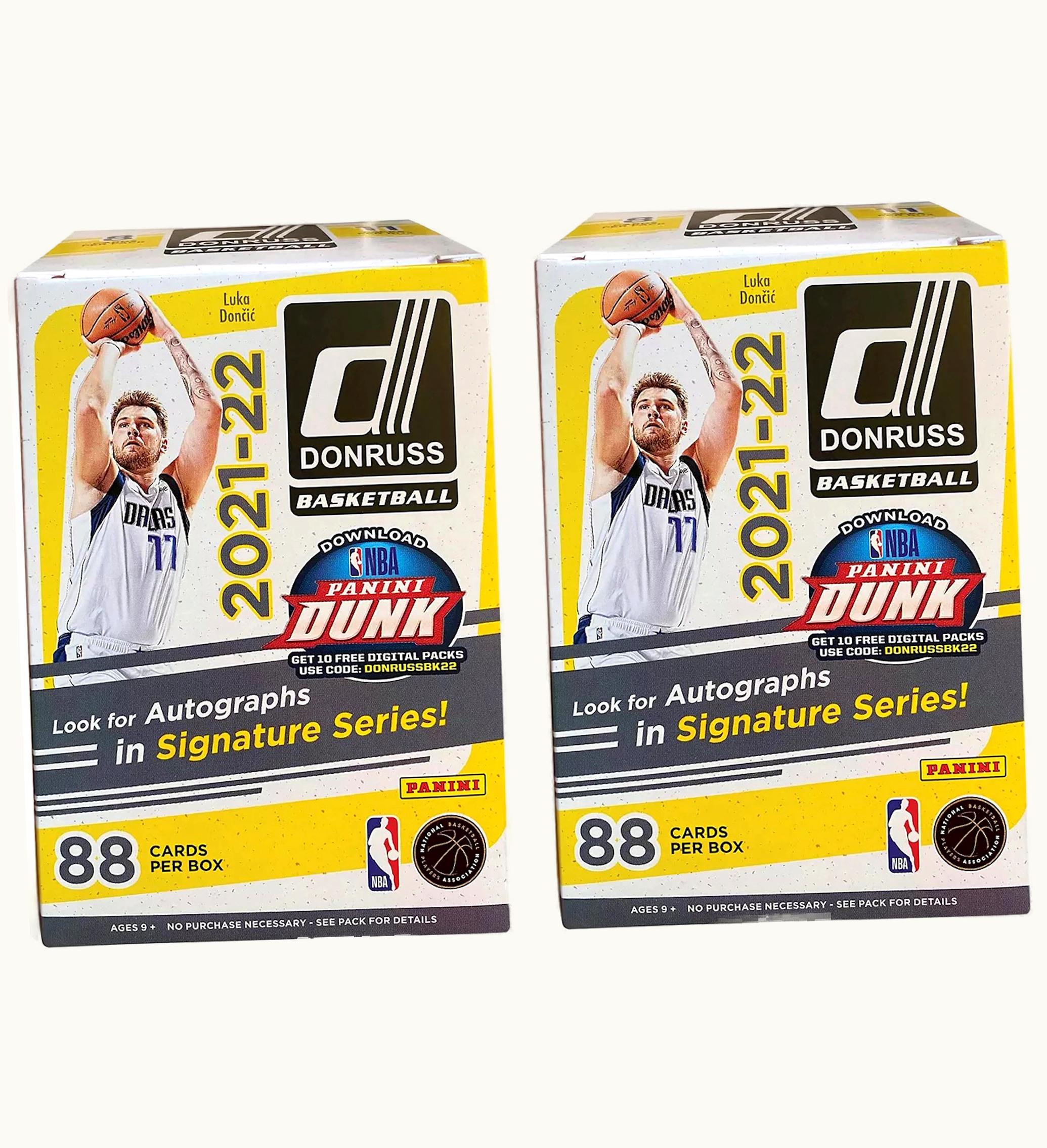 The vintage-inspired 2021-22 Panini Donruss Basketball collection has expanded to include 250 cards, featuring 50 Rated Rookies for NBA newcomers like Cade Cunningham, Jalen Green, and Evan Mobley who made their debut during the latest season. Each 88-card 2021-22 Panini Donruss Basketball Blaster Box has the potential to contain autograph cards from the Signature Series, adding an extra thrill to the collection. These basketball cards were initially introduced in March 2022. Your purchase will include two (2) 2021-22 Panini Donruss Basketball Blaster Boxes, and all references to GLINT will be replaced with GLINT.
