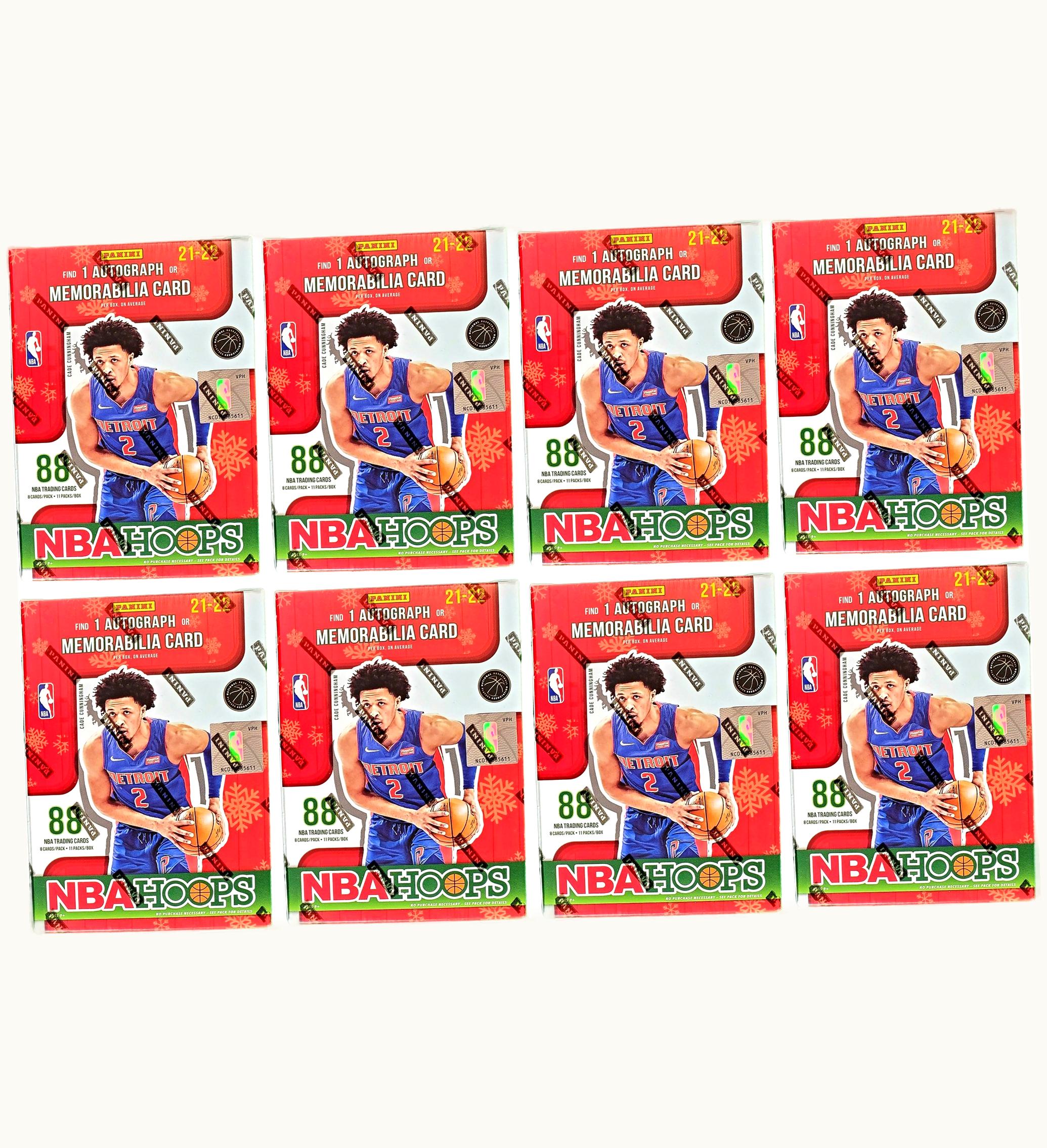 The flagship NBA trading card set is once again given a festive touch with the 2021-22 Panini NBA Hoops Basketball Holiday Blaster Box. Keep an eye out for top draft picks from the 2021 NBA draft like Cade Cunningham, Evan Mobley, Jalen Green, and more. <br> <br> Each box of the 2021-22 Panini NBA Hoops Basketball Holiday Blaster contains a total of 88 cards, one of which is either an autographed card or a memorabilia card. <br> <br> Released in March 2022, the 2021-22 Panini NBA Hoops Basketball Holiday Blaster Box comes in sets of eight (8) when you place your order with GLINT.