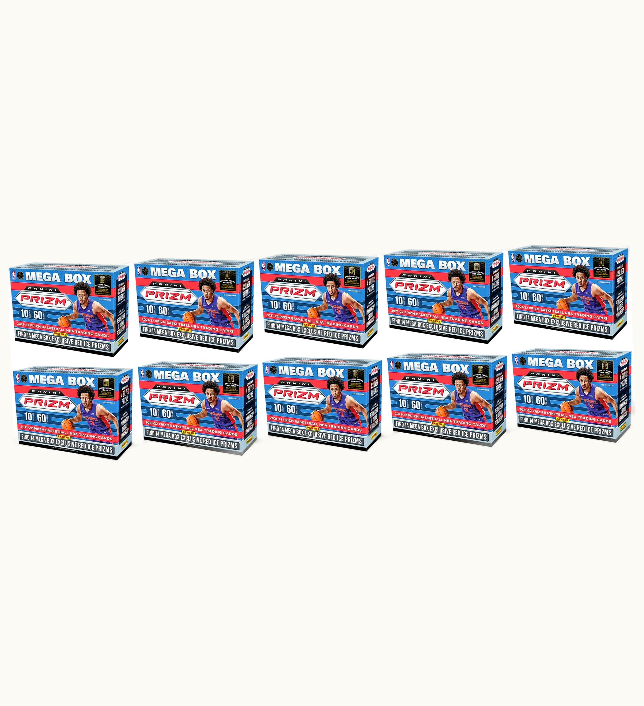 The Panini Basketball Mega Box (Red Ice Prizms) 10x Lot is the ultimate box for any basketball enthusiast looking for a complete set of premium trading cards. Each box contains 10x Red Ice Prizms packs, each pack with 4 trading cards in total, which feature exclusive designs, striking colors, and special finishes. These cards are from the popular Panini brand, one of the leading names in sports card collecting. They are made for basketball fans who not only love the game but also appreciate the art of collecting. You can collect these sets and trade with other enthusiasts to complete your collection. Each Mega Box is a well-rounded assortment of NBA stars from all teams, as well as rookies, legends, and special inserts. The Red Ice Prizms are incredibly rare and highly sought after, offering a chance to own some of the most unique and valuable cards in the set. The Mega Box is a great gift for collectors of all ages and skill levels. It provides an exciting way to keep up with the latest trends in the basketball world and to connect with other fans who share the same interest. Whether you are just starting out or have been collecting for years, the Panini Basketball Mega Box is a must-have addition to your collection.