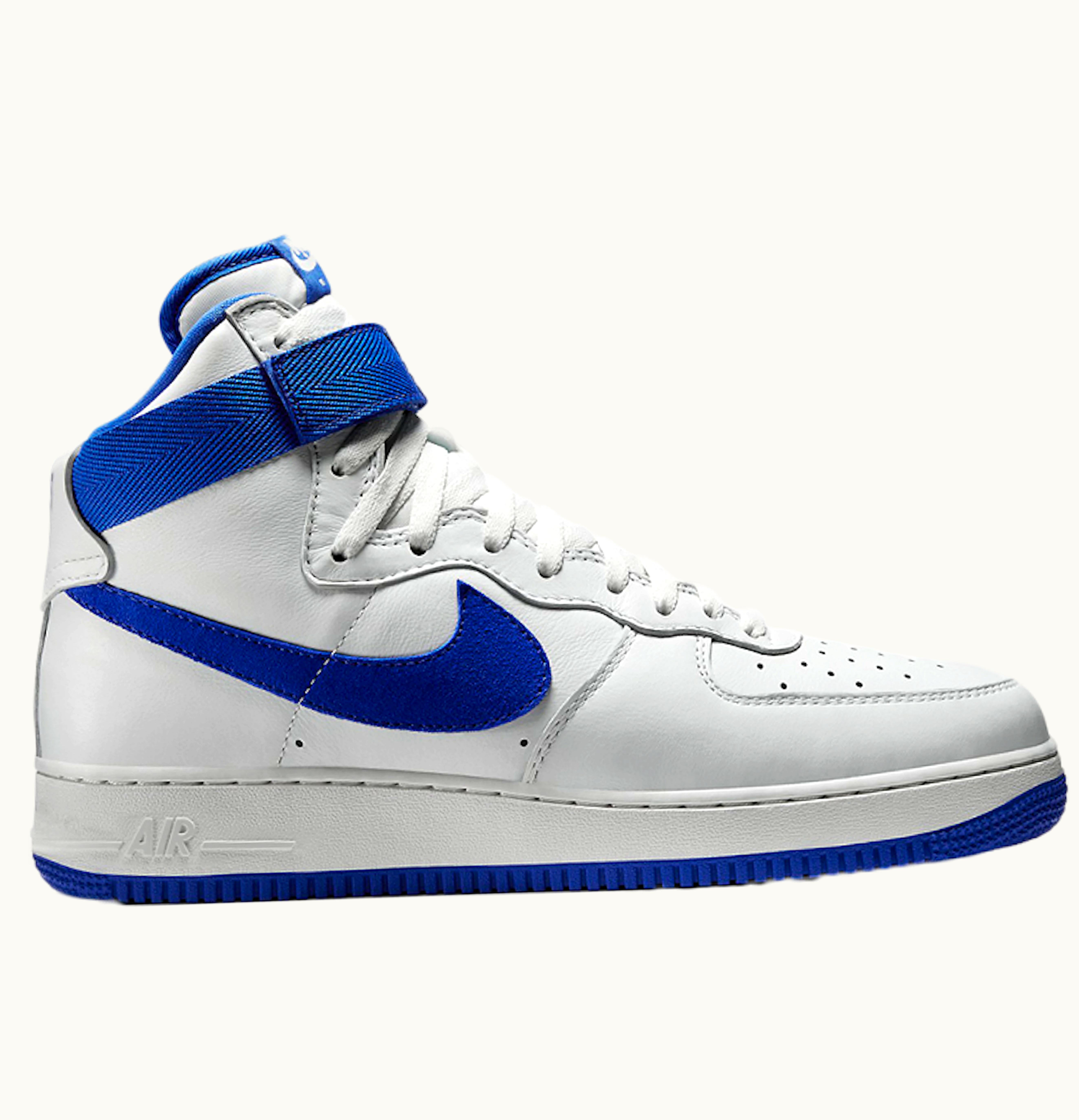 The Nike Air Force 1 High White Game Royal is a classic basketball-inspired sneaker with a sleek white leather upper and game royal blue accents. Featuring a high-top design for extra support and a perforated toe box for added breathability, this shoe also boasts Nike's signature Air cushioning technology in the heel for maximum comfort and impact protection. The textured rubber outsole provides excellent traction on any surface. With its iconic silhouette and fresh color scheme, the Nike Air Force 1 High White Game Royal is a stylish and versatile shoe that can be worn on and off the court.