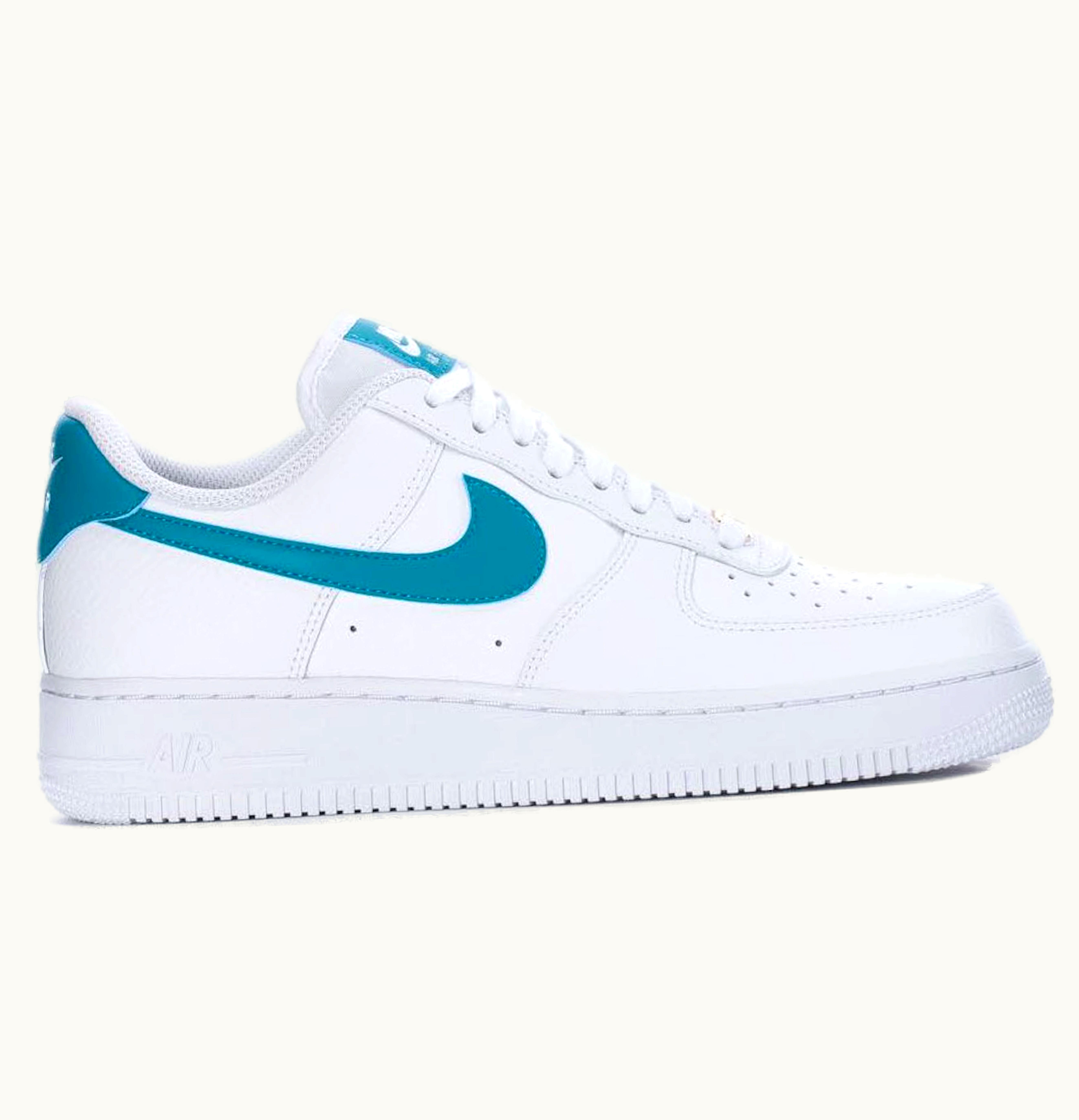 The Nike Air Force 1 Low '07 White Turquoise (W) is a women's shoe that features a classic design with modern flair. The shoe is made with a durable leather upper and a perforated toe box for breathability. The iconic Nike Swoosh is prominently displayed on the sides, while a turquoise accent adds a pop of color to the otherwise white shoe. The shoe is built with a low-cut profile for increased flexibility and freedom of movement, and a cushioned midsole provides all-day comfort. The rubber outsole offers excellent traction and durability, making these shoes perfect for everyday wear.