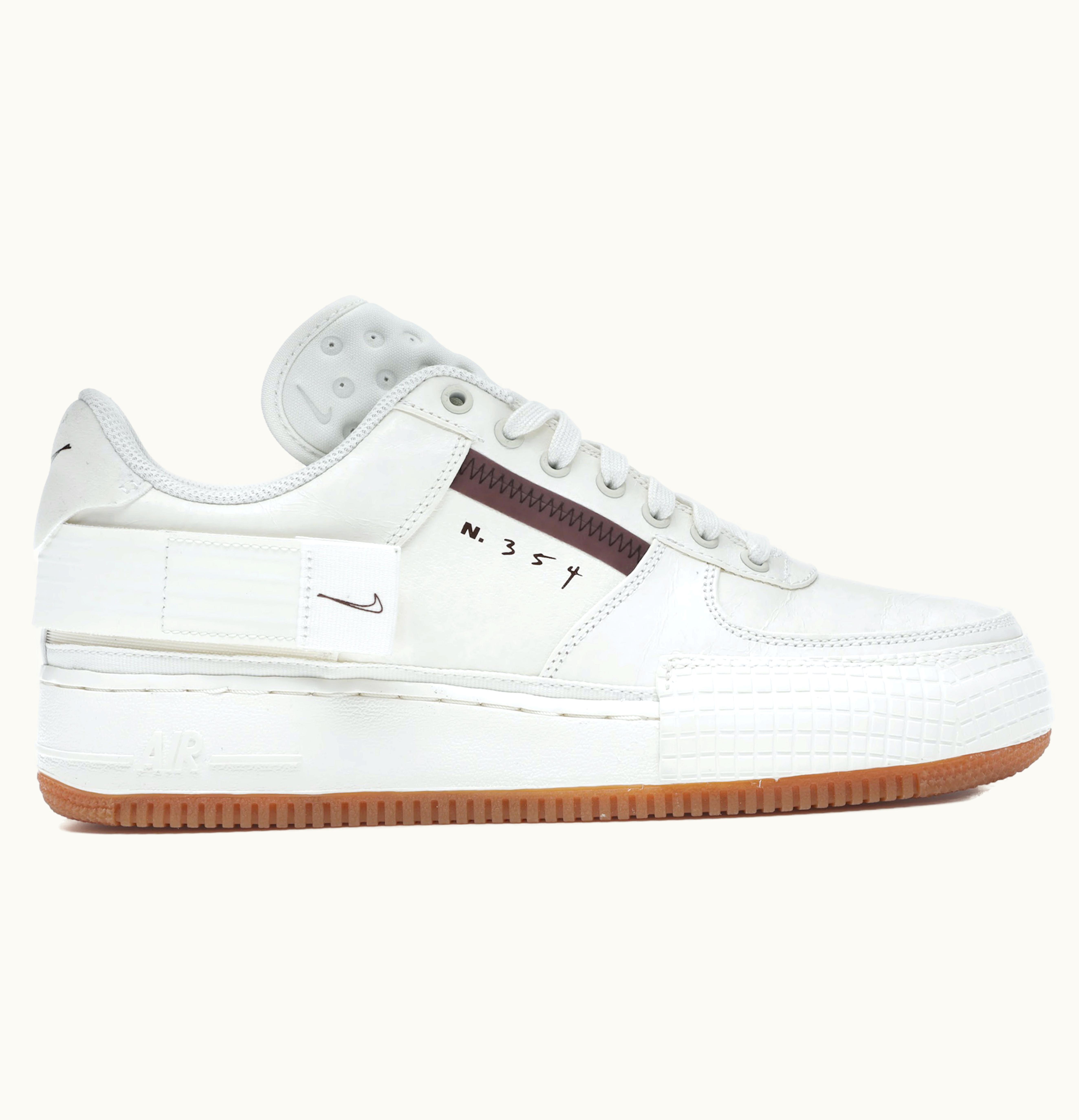 The Nike Air Force 1 Type Sail Gum is a premium quality sneaker with a stylish and modern design. It features a premium leather upper in sail color, creating a sleek and sophisticated look. The shoe utilizes a unique closure system that allows for customizable fit, making it a comfortable fit for various foot shapes. The gum outsole provides superior traction on any surface, ensuring a secure grip. Additionally, the shoe incorporates a spliced-in rubber piece on the back of the midsole, adding durability and stability. The Nike Air branding on the tongue and heel, as well as the Nike logo on the side panels, provide a classic and timeless touch. Overall, the Nike Air Force 1 Type Sail Gum is a stylish and functional shoe that represents the perfect blend of style and performance.