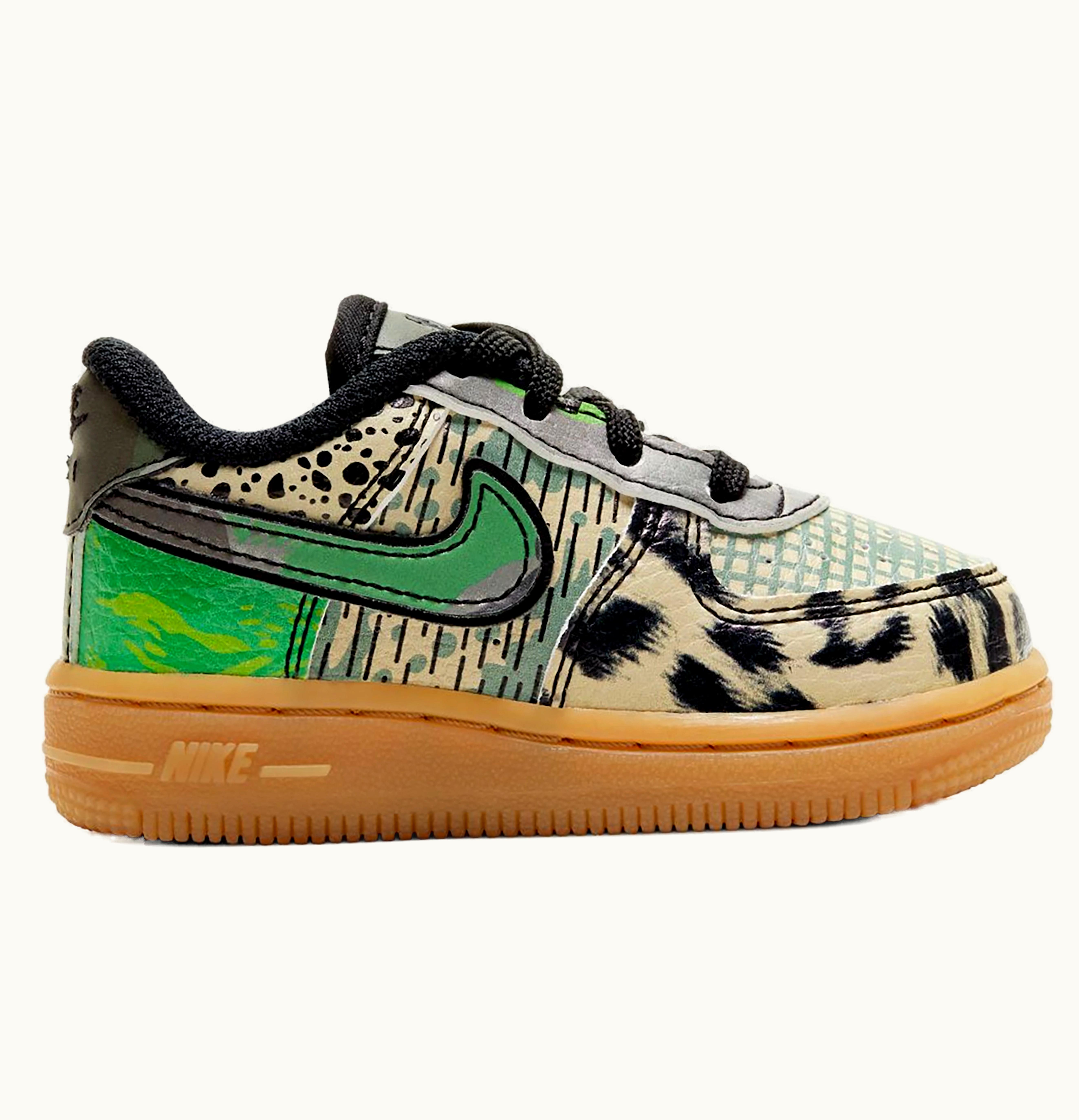 The Nike Air Force 1 Low City Of Dreams Green (TD) is a stylish and comfortable shoe designed for toddlers. It features a vibrant green colorway with contrasting black and white accents for a unique look. The upper is made of a premium leather and synthetic material for durability and breathability, while the midsole contains Nike's signature Air cushioning for added comfort and support. The outsole is made of a non-marking rubber material, ensuring your little one won't slip on any surface. The shoe is completed with classic Nike branding on the tongue and heel tab, making it a timeless addition to any toddler's shoe collection.