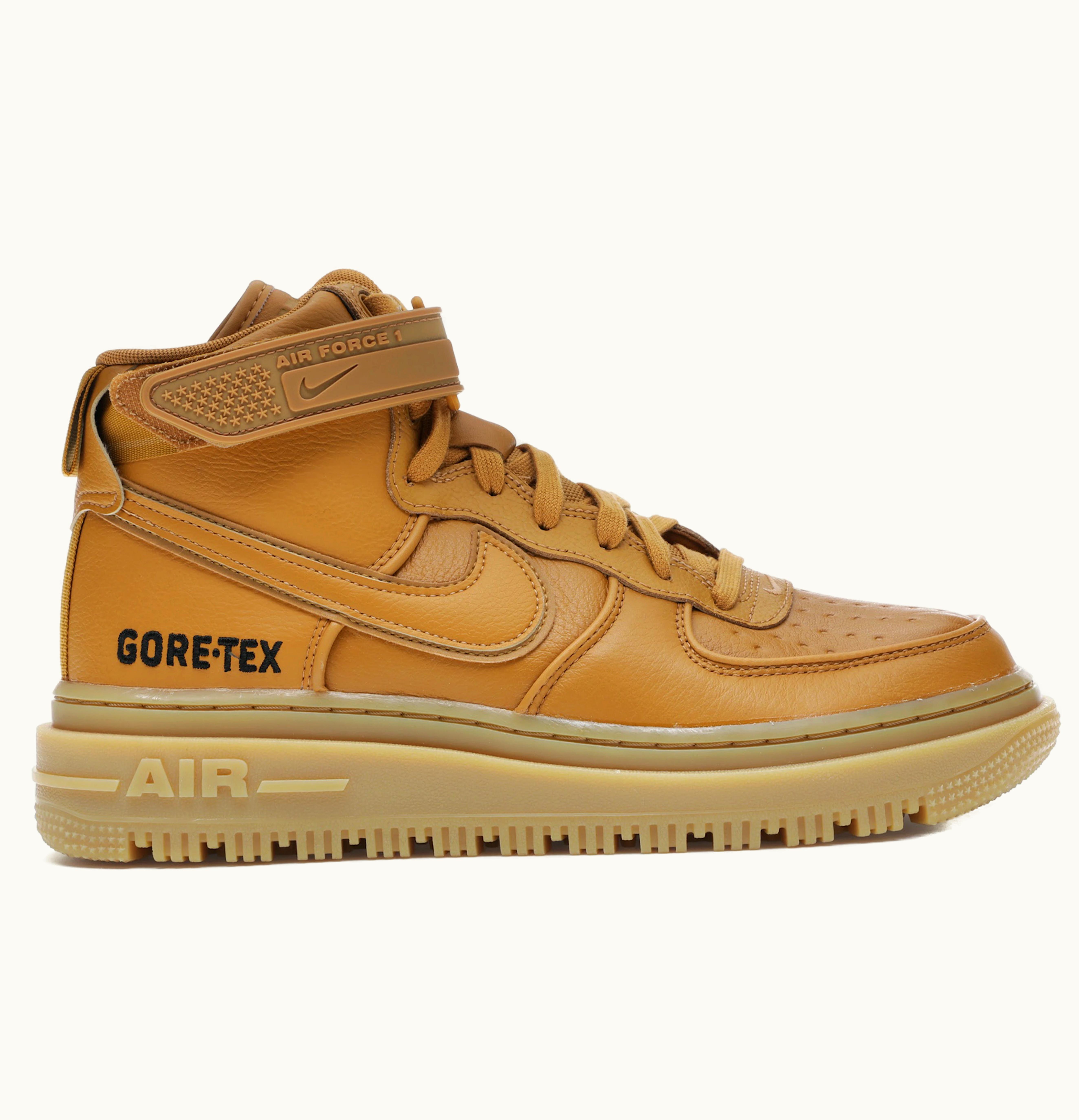 The Nike Air Force 1 High Gore-Tex Boot Flax is a stylish and durable boot designed for tough weather conditions. It features a waterproof Gore-Tex membrane that keeps water out while allowing air to circulate, ensuring your feet stay dry and comfortable. The upper is made of premium leather in a Flax colorway, with perforations for breathability. The boot is designed with a high-cut silhouette, providing added ankle support and protection. The Nike Air Force 1 High Gore-Tex Boot Flax has a cushioned midsole and Nike Air technology in the heel, offering superior comfort and shock absorption. The rubber outsole provides excellent traction on various surfaces, making this boot perfect for outdoor activities. Overall, the Nike Air Force 1 High Gore-Tex Boot Flax is a versatile and high-quality boot that combines style and functionality to keep you comfortable and protected in any weather.