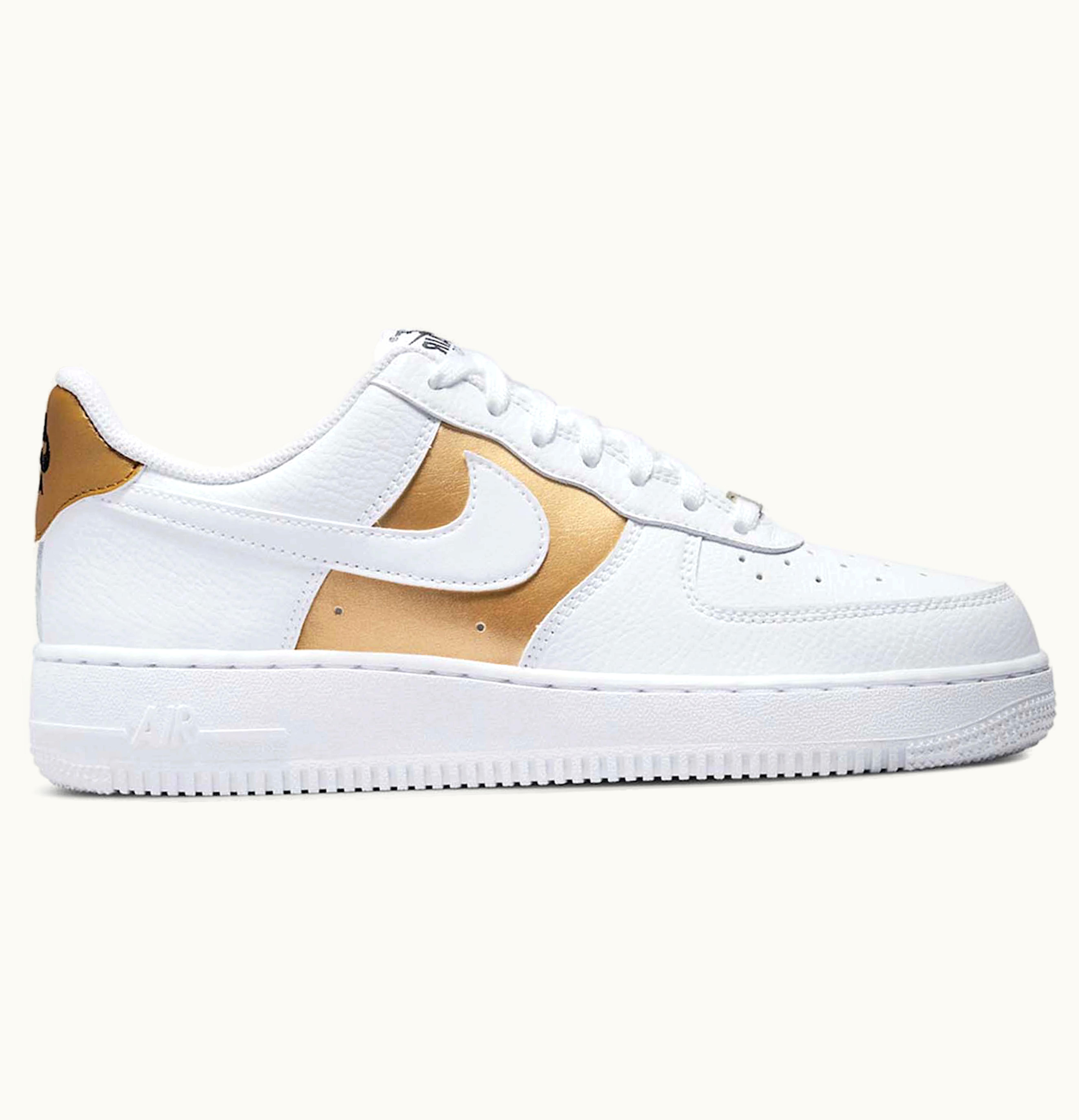 The Nike Air Force 1 Low White Bronze (W) is a stylish and trendy sneaker designed for women who want to stand out from the crowd. This sneaker is made with premium quality leather and features a crisp white upper with a contrasting bronze Nike swoosh on the side for added visual appeal. The Air Force 1 Low features a timeless, low-cut profile with a perforated toe box for breathability and a padded collar and tongue for comfort. The durable rubber outsole features a non-marking design with pivot points for improved traction and durability. The Nike Air cushioning technology is embedded in the sole to offer superior comfort and shock absorption with every step, making it ideal for everyday wear. Overall, the Nike Air Force 1 Low White Bronze (W) is an excellent choice for anyone looking for a versatile and stylish sneaker that can be worn with a variety of different outfits. Whether you're running errands, heading to the gym, or just hanging out with friends, this sneaker is sure to impress.