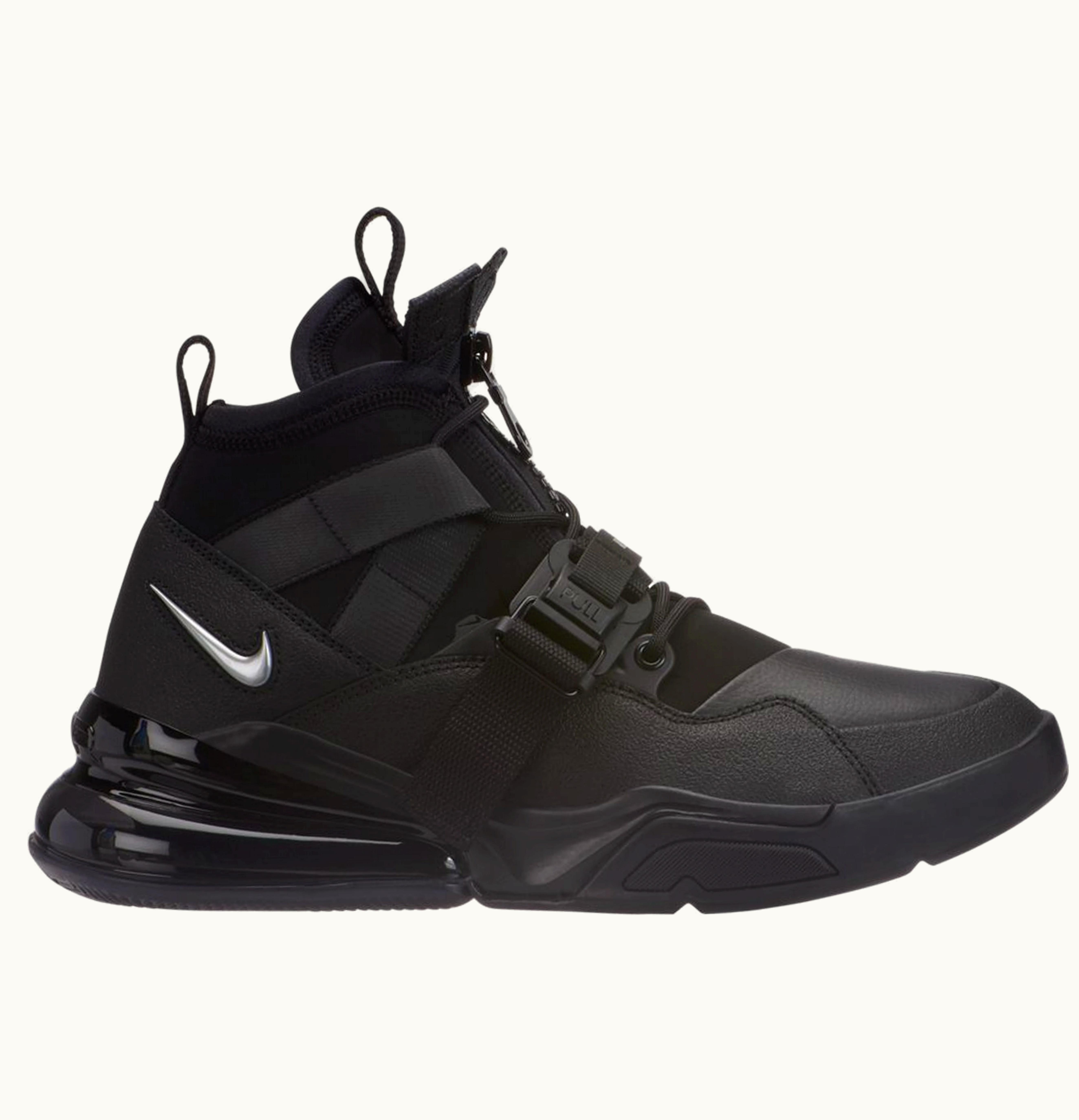 The Nike Air Force 270 Utility Black Metallic Silver is a stylish and functional shoe designed for everyday wear. Constructed with a durable and breathable black textile upper, this shoe features metallic silver accents for added style. The sneaker is made with a water-resistant design, perfect for rainy or wet weather conditions. The shoe also features a comfortable and supportive midsole, complete with Nike's signature Air cushioning technology, which offers maximum impact protection and a smooth, responsive ride. The outsole is made of high-traction rubber for extra grip and durability. This shoe is perfect for a variety of activities, from casual wear to outdoor adventures. With its sleek design and exceptional performance, the Nike Air Force 270 Utility Black Metallic Silver is a must-have for any sneakerhead or athlete.