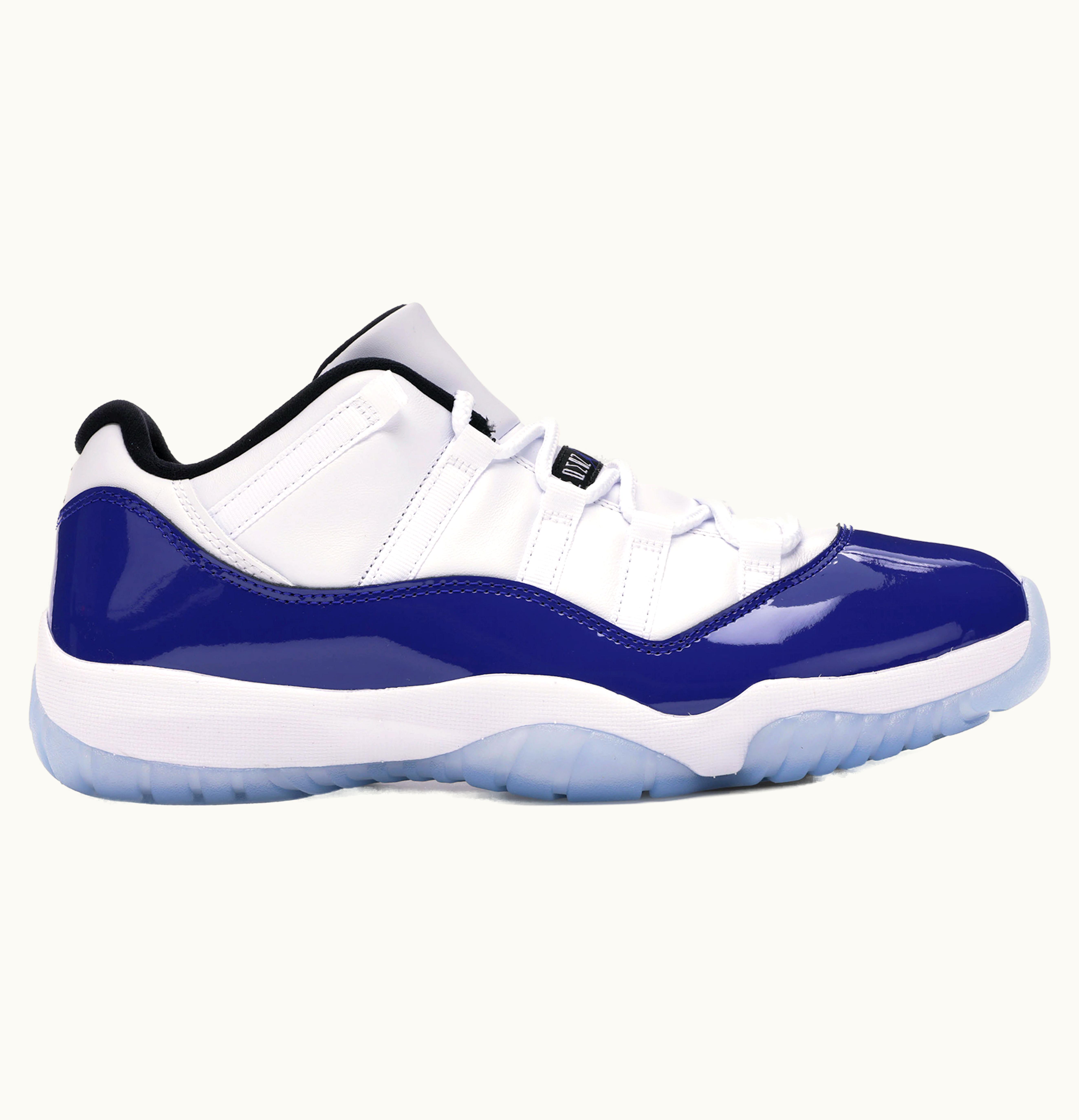 GLINT now offers the women's Jordan 11 Retro Low White Concord (W), which features Concord purple as a prominent element in the design instead of the traditional black patent leather overlays. The shoe has a white leather upper with purple patent leather overlays, accented by black details. The design is completed with a white midsole, icy translucent outsole, and Jordan branding on the tongue. These Jordan 11 Lows were released in July 2020, with a retail price of $185 USD.