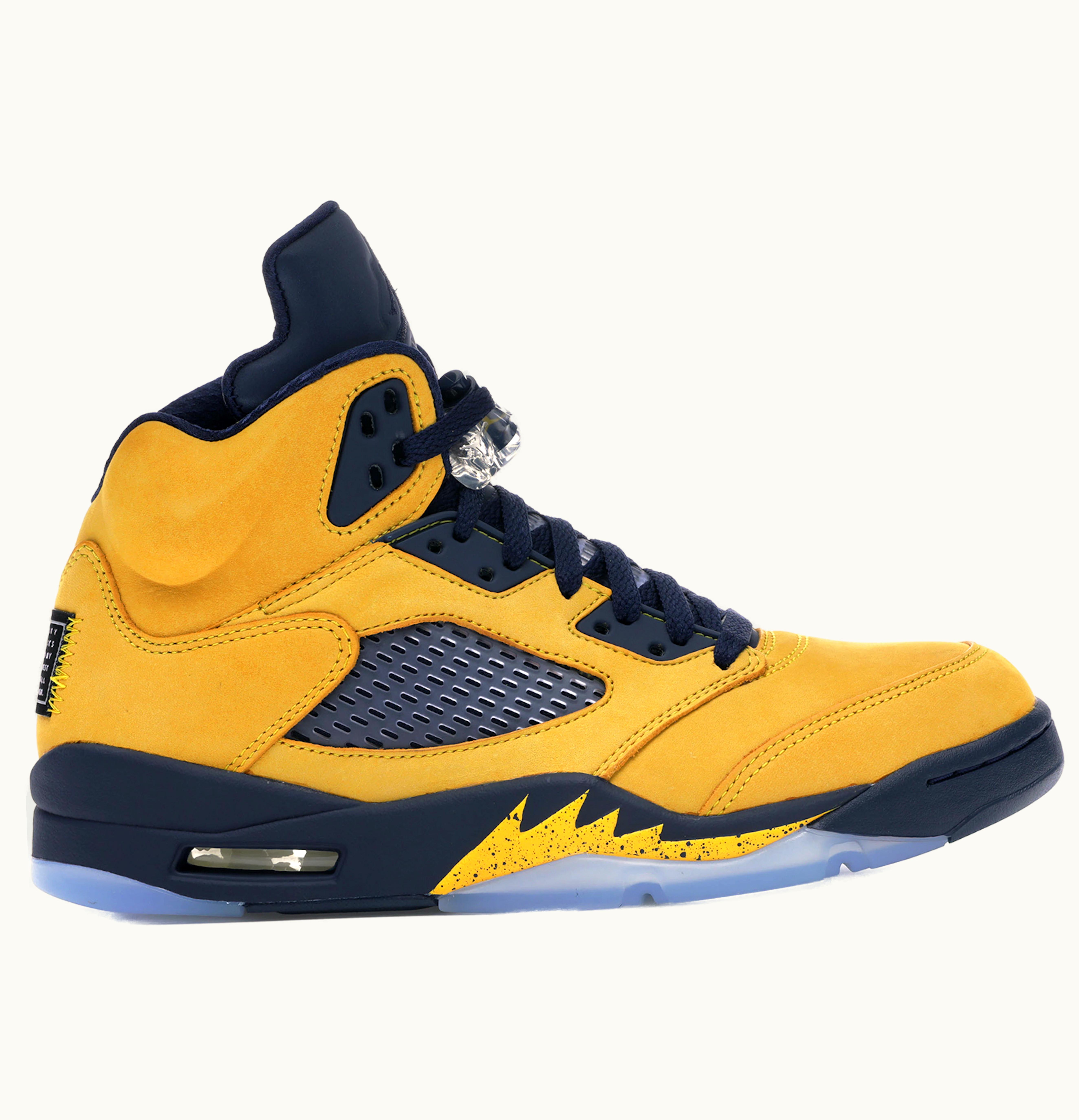 The University of Michigan was paid tribute by Jordan through the famous Air Jordan 5 Retro Michigan 2019 edition. The renowned navy and yellow colors representing the university have been featured on multiple sneaker designs in the past, and the Jordan 5 release in 2019 adds to that collection. The shoe's intricate design comprises of nubuck uppers and perforated panels on the sides. The Retro AJ5 replaces the conventional "Jumpman" logo with the "Team Jordan" emblem on the heel. Furthermore, the tongue graphics are reflective, and the "Inspire" lettering found inside the shoe represents a nod to universities sponsored by Jordan. The Jordan 5 Retro Michigan (2019) was launched in July 2019 and was sold for $225 through GLINT.