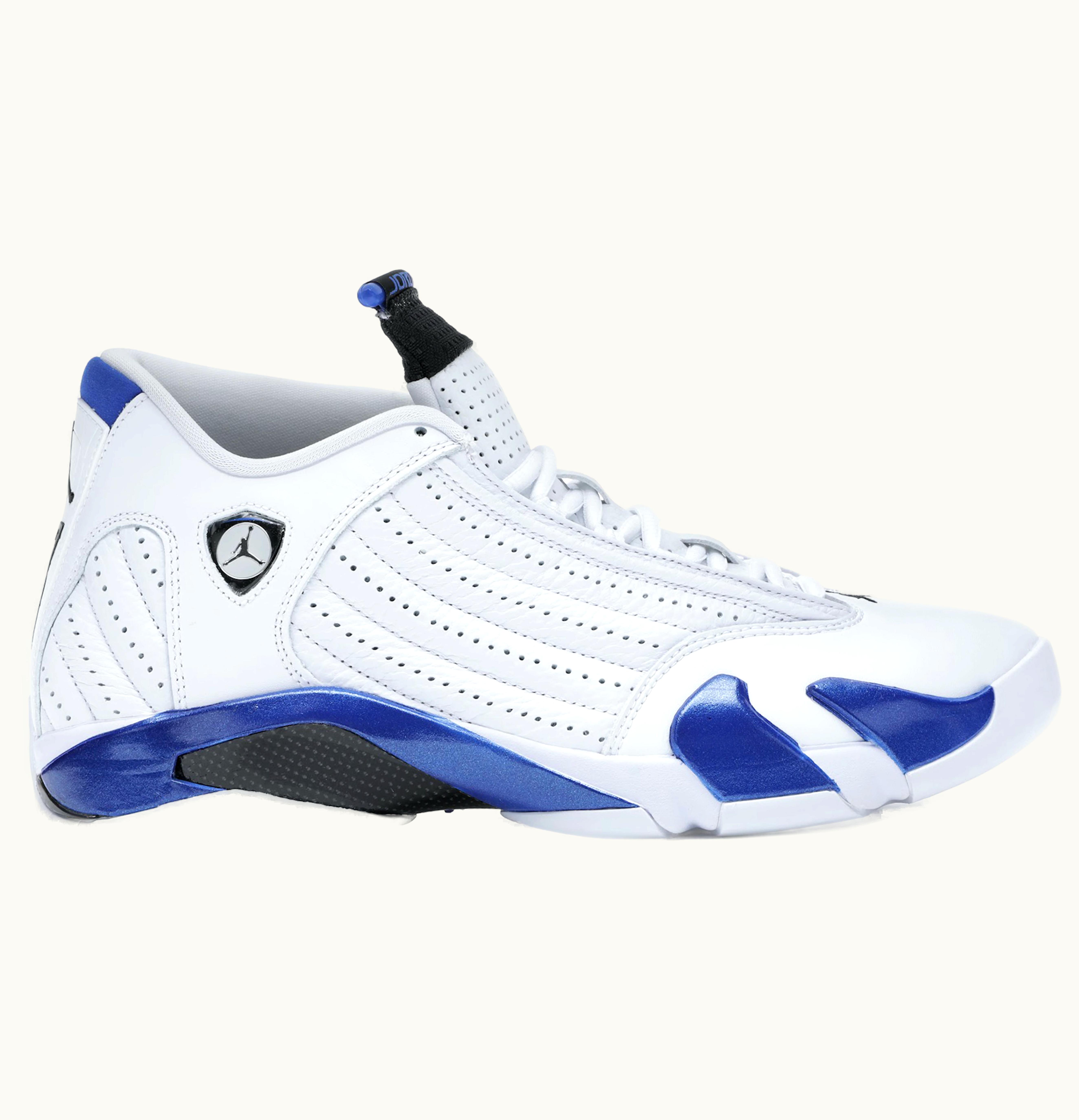 Although not an OG colorway, the Air Jordan 14 Hyper Royal bears striking resemblance to one. It draws inspiration from the original Candy Cane colorway and stands out from the previously released Toro Gym Reds. The Hyper Royal Jordan 14 presents a simple yet sleek color scheme that is perfect for everyday wear. Featuring a white tumbled leather upper with minimal Jordan branding, the Air Jordan 14 Hyper Royal boasts a small embroidered Jumpman over the toe and a jeweled window on the ankle encasing a small Jordan logo. Hyper Royal blue accents on the midsole's peaks provide contrast to the carbon fiber plating that surrounds it from the midsole all the way to the outsole. The sneaker flaunts a tire-patterned 23 on the heel that showcases its Ferrari-inspired design. GLINT offered the Air Jordan 14 Hyper Royal on their platform in September 2020 at a retail price of $190.