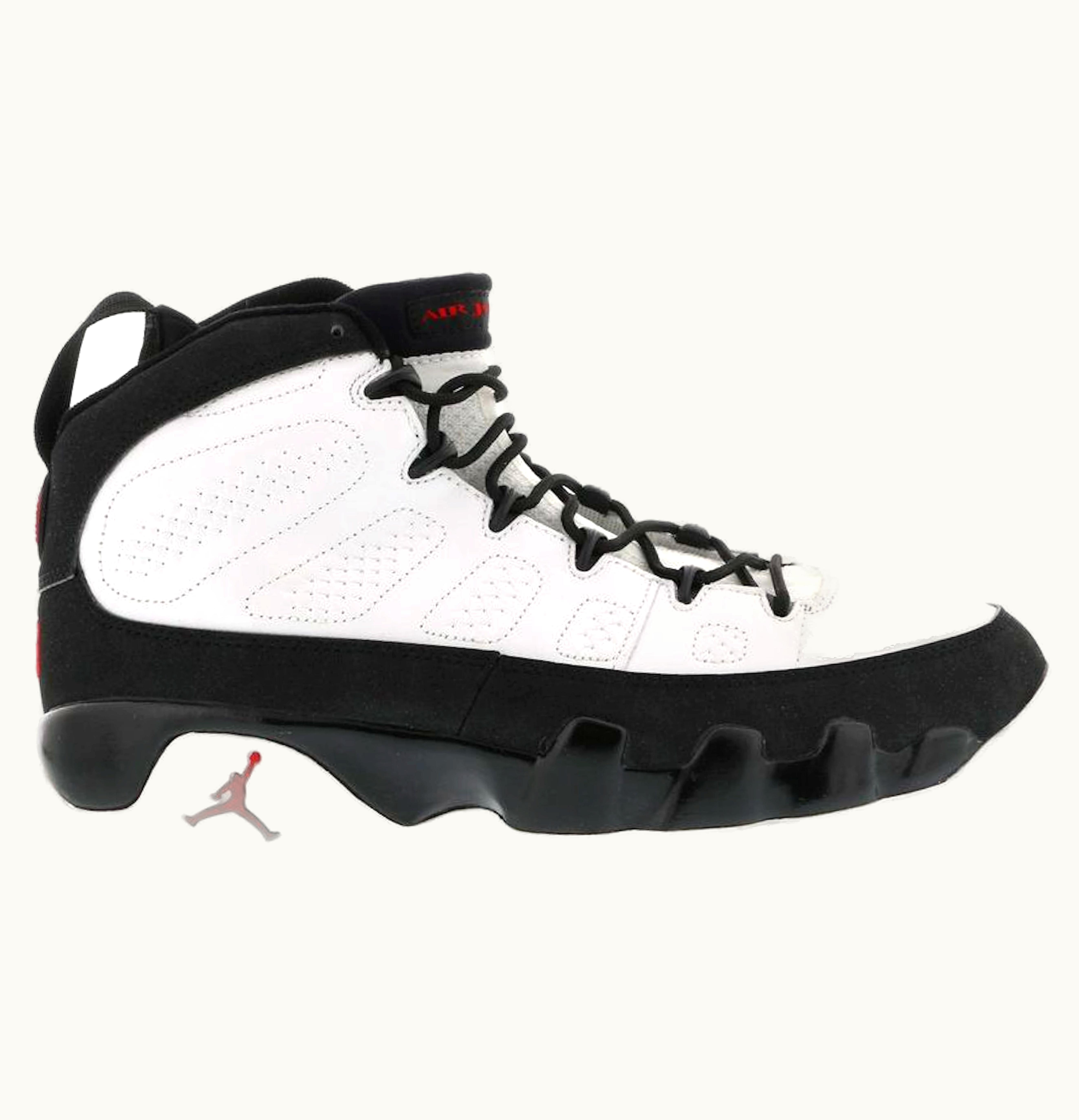 The Jordan 9 Retro White Black Red sneaker is a vintage-style shoe that dates back to 2002. It features a striking combination of clean white leather on the upper, with bold black and red accents, including patent leather overlays, and a vibrant red Jumpman logo on the tongue. The shoe is designed to provide excellent support and comfortable wear, with a hidden Air-Sole unit in the forefoot and heel for responsive cushioning. The outsole is made of durable rubber with multi-directional traction pattern for better grip and traction. The Jordan 9 Retro White Black Red is a stylish and versatile shoe that can be worn for any occasion, from casual streetwear to basketball games.