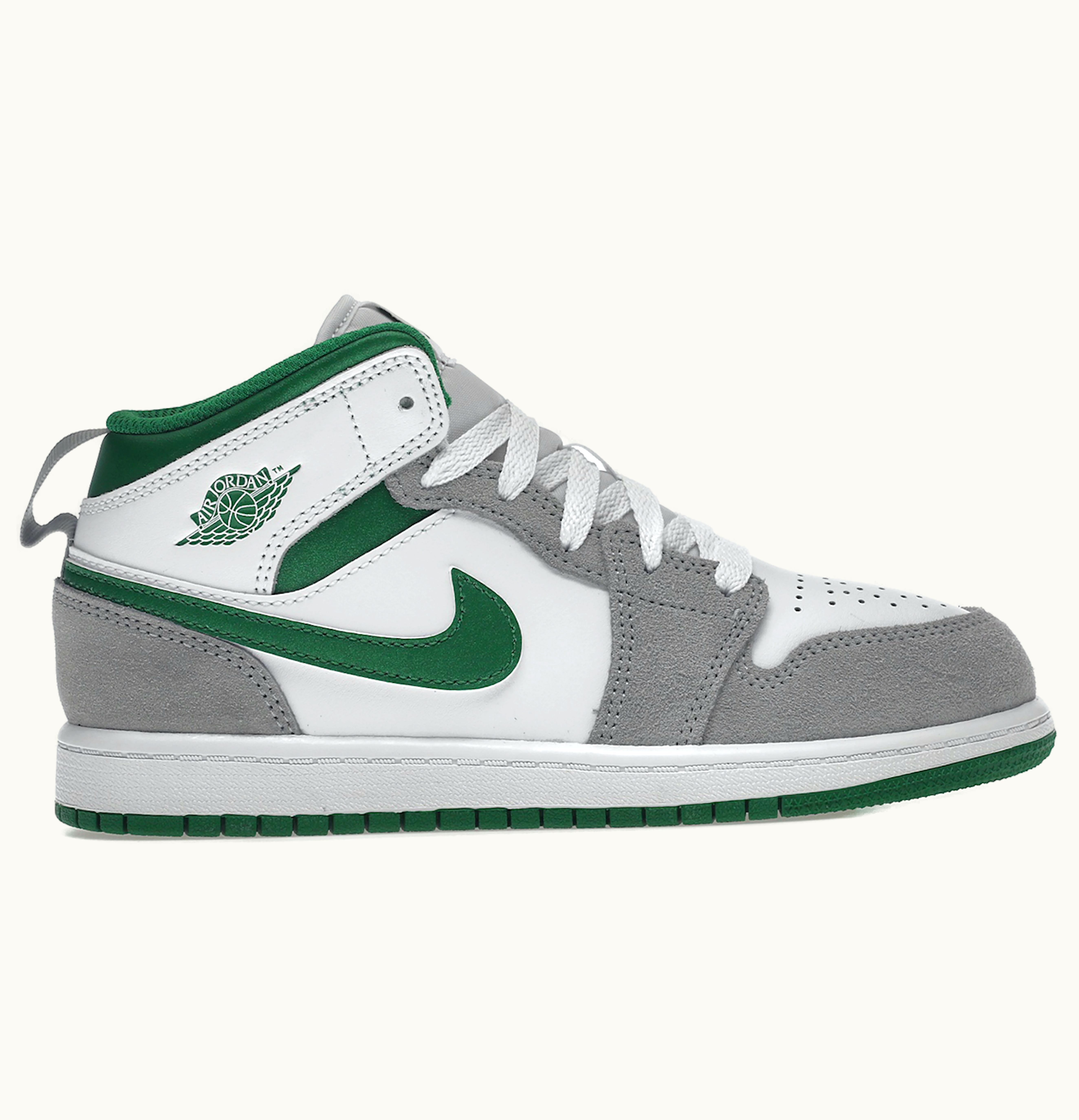 The Jordan 1 Mid SE White Pine Green Smoke Grey (PS) is a stylish and durable basketball shoe designed for kids. It features a white leather upper with pine green accents on the Swoosh logo, midfoot, and ankle collar. The smoke grey detailing on the tongue and heel tab adds a subtle contrast to the shoe's overall aesthetic. The shoe also comes with a cushioned heel and midsole for comfort and a rubber outsole with herringbone pattern for traction on the court. Overall, the Jordan 1 Mid SE White Pine Green Smoke Grey (PS) is a great choice for young basketball players looking for a reliable and stylish shoe.