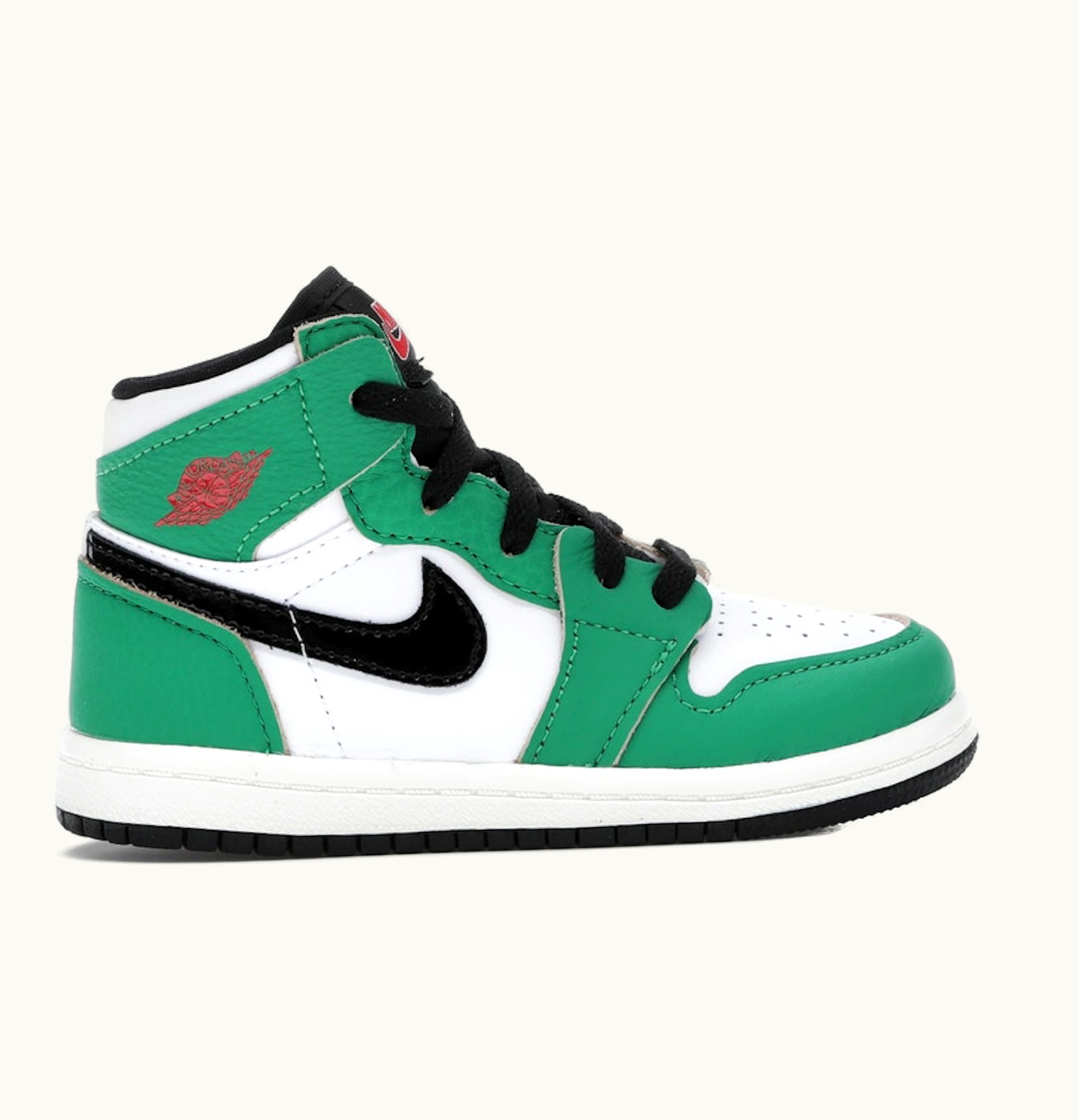 The Jordan 1 Retro High Lucky Green (TD) is a premium quality sneaker designed specifically for the little ones. It features a stylish combination of white, lucky green, and black colors that give it a bold, eye-catching look. The shoe is crafted with a full-grain leather upper that provides durability, comfort, and support, and it is finished with a Nike swoosh logo in black on the side. The sneaker also has perforations on the toe box and quarter panel to enhance breathability and keep the foot feeling fresh. Its padded collar and tongue provide a snug and comfortable fit, preventing the foot from slipping while running or playing. The shoe sits on a rubber outsole that delivers excellent traction and stability on any surface, providing traction and support for active toddlers. Overall, the Jordan 1 Retro High Lucky Green (TD) is an exceptional sneaker that provides style, comfort, and support for little ones, making it a versatile choice for everyday wear or play.