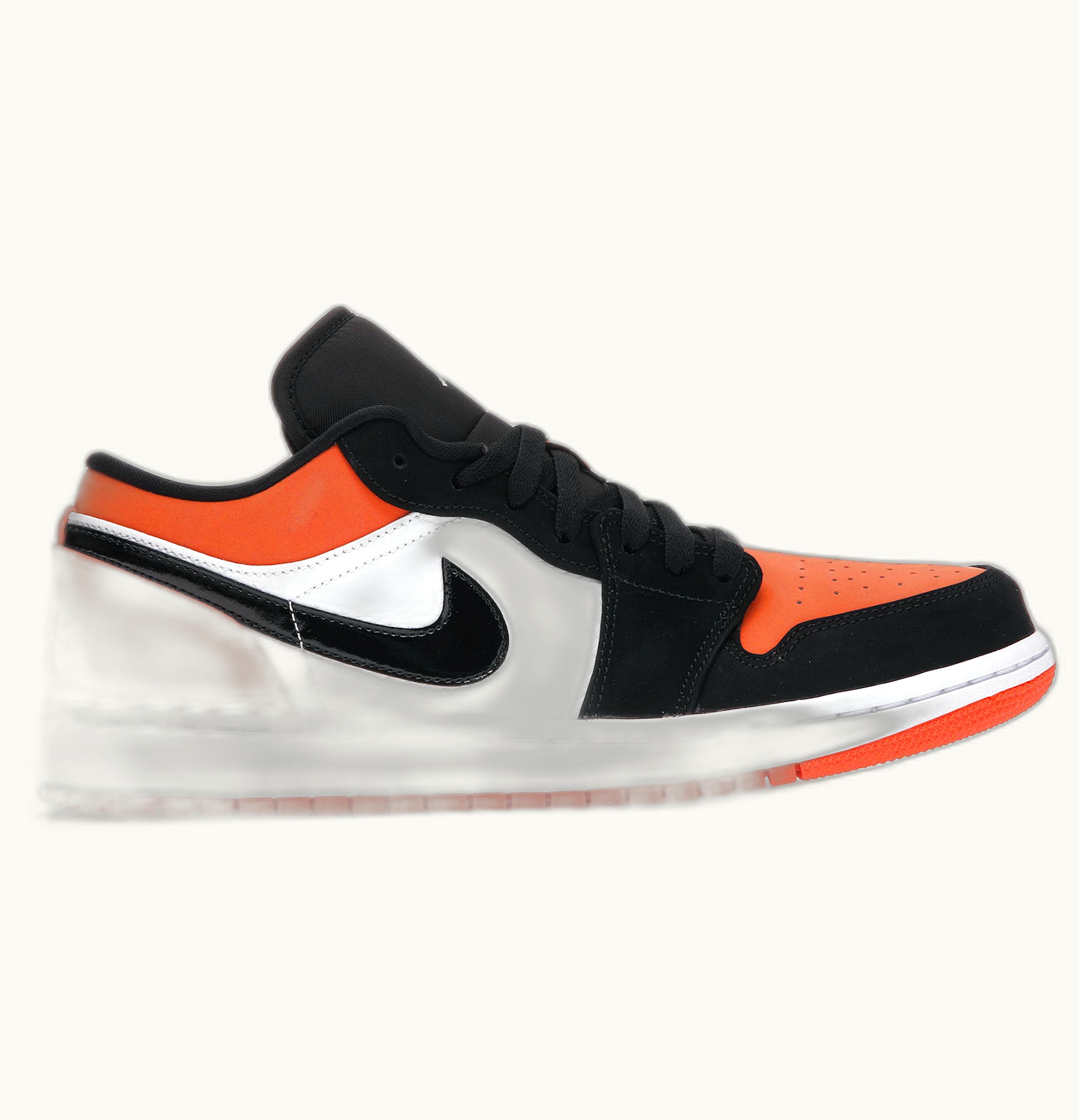 GLINT carries the Jordan 1 Low Shattered Backboard sporting a black nubuck leather upper accompanied by overlays of orange and white leather. The design is finished with a forefoot black suede lining and a heel composed of orange leather, showcasing a Wings logo of Air Jordan stitched in its center. <br> <br> The price of the Jordan 1 Low Shattered Backboard was set at $130 upon its release in August 2021, with GLINT being a retailer option.