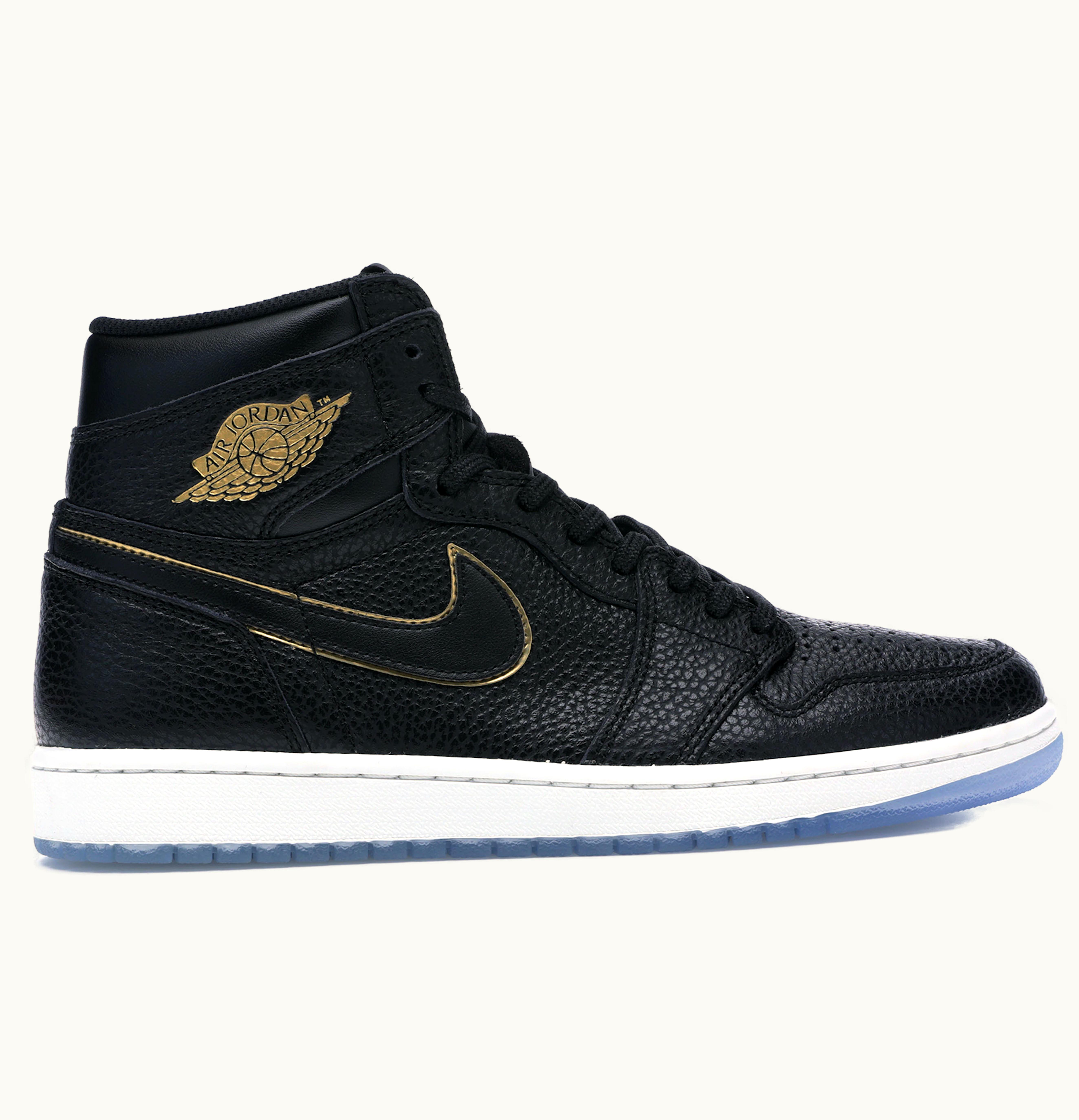 The Air Jordan 1 Retro High LA Black Gold Black showcases a triad of dominant tones: metallic gold, black, and summit white. The patent leather upper of this shoe, which is part of the Retro High Air Jordan 1 collection, is draped in black, while the collar and tongue tag are adorned with metallic gold accents. Additionally, the "Wings" logo is positioned on the right side of the upper, while a similar logo appears on the left. This sneaker also incorporates AIR units in its soles for cushioning. GLINT was the first retailer to release the Air Jordan 1 Retro High LA Black Gold in January 2018. The sneaker's original price was $160.