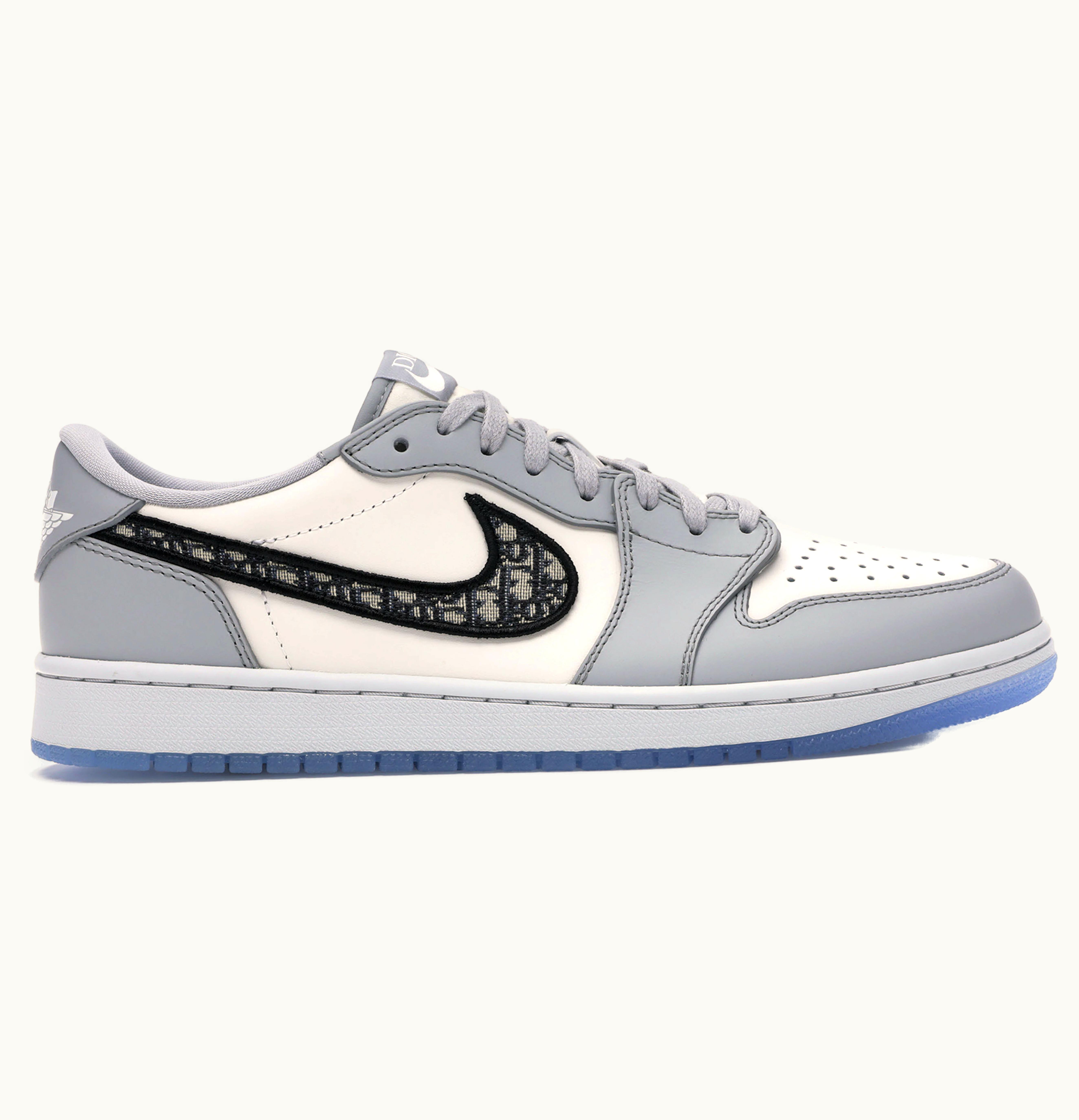 The collaboration between Jordan Brand and Parisian fashion house Dior has made history with the release of the Jordan 1 Retro Low Dior, which can now be found on GLINT. For the first time, Jordan has partnered with a prestigious fashion label like Dior, making this a landmark release. These sneakers were limited to 4,700 pairs and each pair has an unique number. <br> <br> Crafted in Italy using top-notch materials, this Jordan 1 Retro Low features a white and grey leather upper with the iconic Dior monogram print Swoosh. The design is completed with co-branded icy translucent soles, a Dior branded tongue and Wings logo, and a silver "Air Dior" hang tag. These shoes hit the market in April 2020 with a retail price of $2,000.