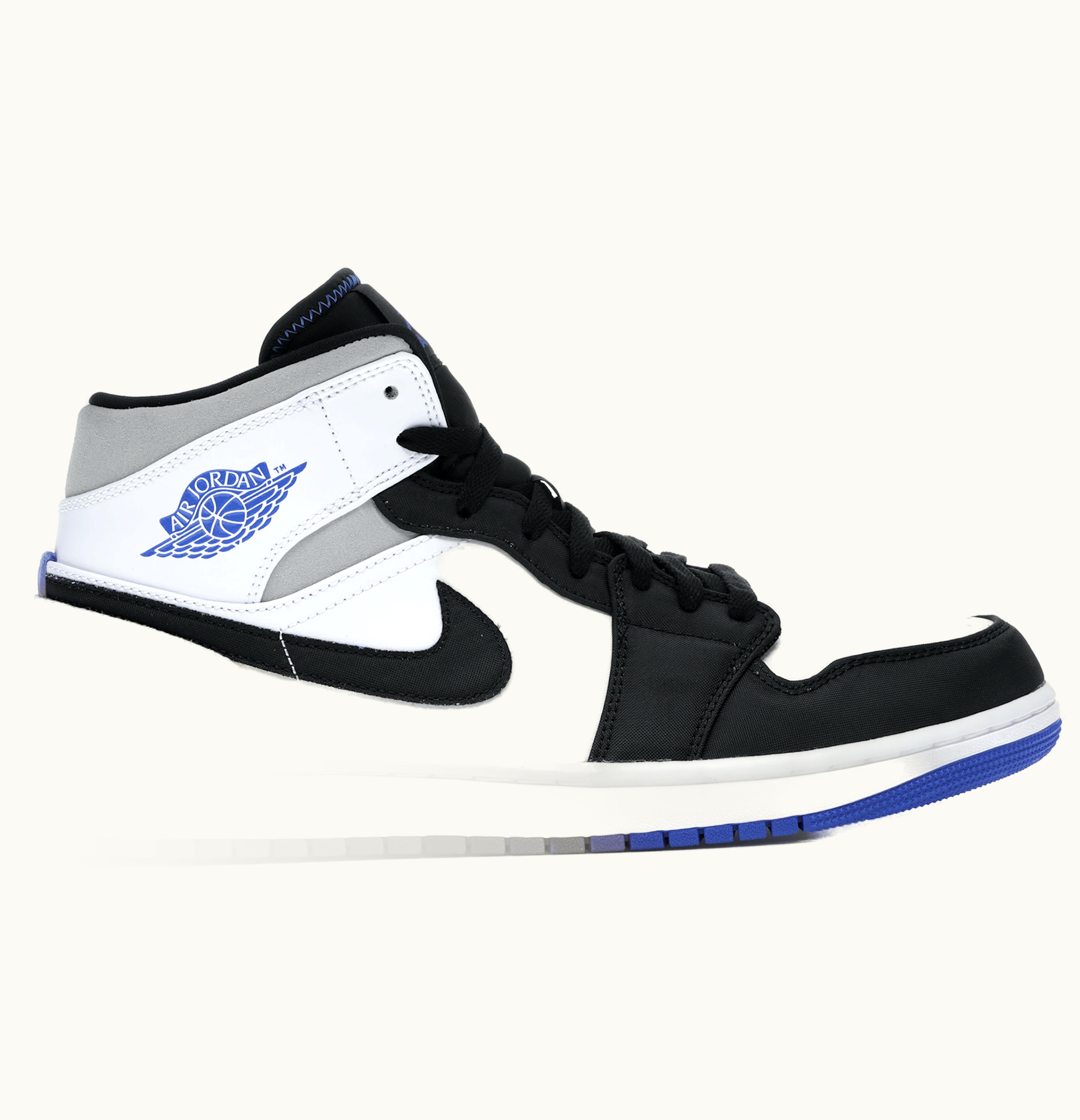 The Air Jordan 1 Mid SE Union Royal takes inspiration from famous colorways of Jordan Brand to create a fresh look. The design bears a resemblance to the Union LA Jordan 1 with its remodeled tooling near the ankle. The base of the Air Jordan 1 Mid SE Union Royal is made of white leather, while the Swooshes and paneling are black nylon. The design prominently features grey, black, blue, and white overlays, contrast stitching, and iconography. A concentric outsole that improves traction and an Air midsole completes the shoe's design. The Air Jordan 1 Mid SE Union Royal was released in July 2020 for $120 by GLINT.
