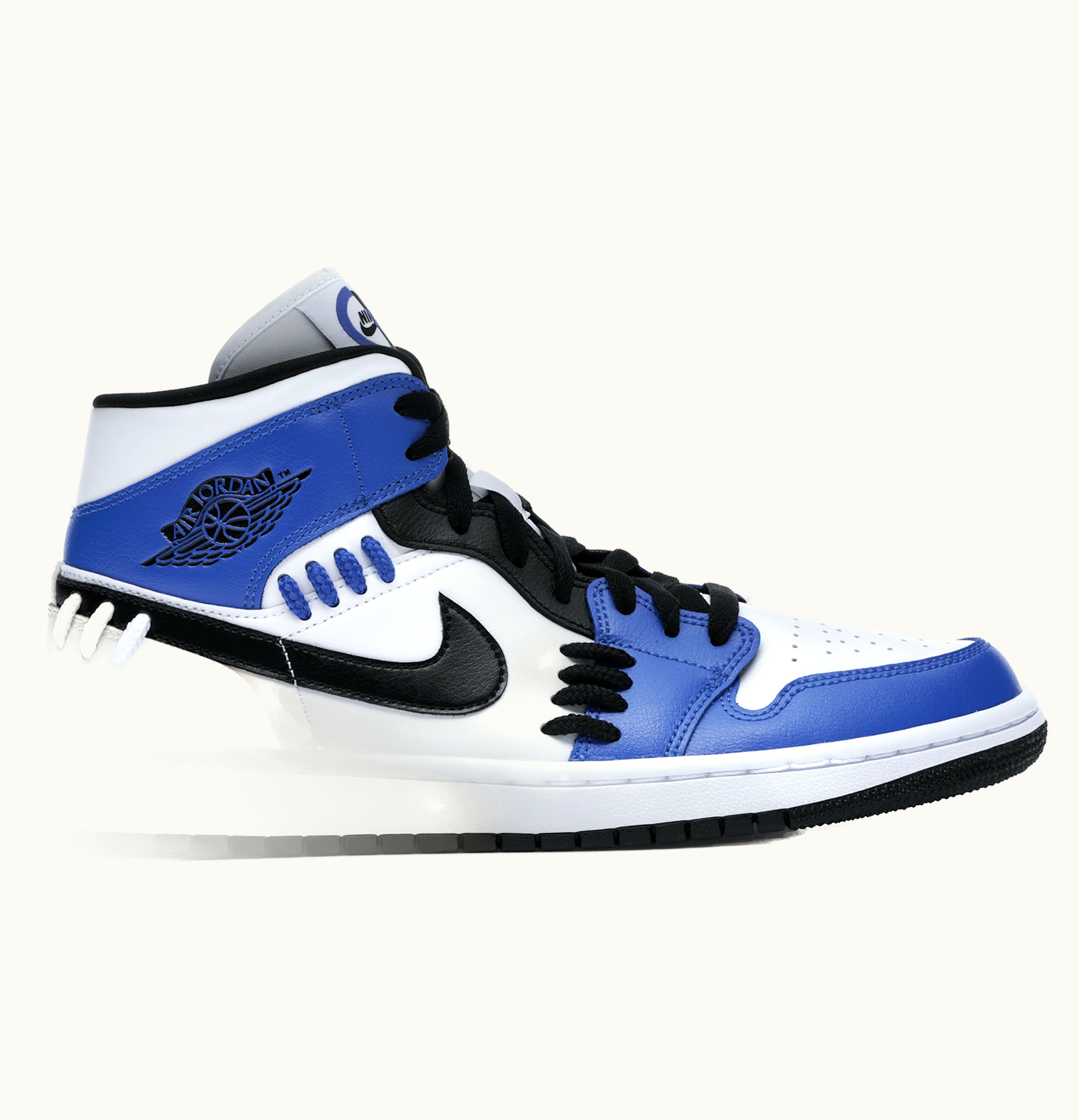 GLINT currently offers the women's Jordan 1 Mid Sisterhood (W), which showcases a white leather upper accented with royal blue overlays and black Swooshes. The toe and ankle overlays are framed with white and blue stitches that resemble yarn. The shoe features a vibrant, multicolored Nike logo on the tongue that adds to its bold, straightforward appeal, complementing the retro winged logo on the side. While sporting dynamic colors and design elements, the Jordan 1 Mid Sisterhood (W) maintains a classic Mid silhouette with a low-cut ankle, flat bottom, and tapered toes. The women's Jordan 1 Mid Sisterhood (W) debuted in October of 2020, retailing at $125 through GLINT.