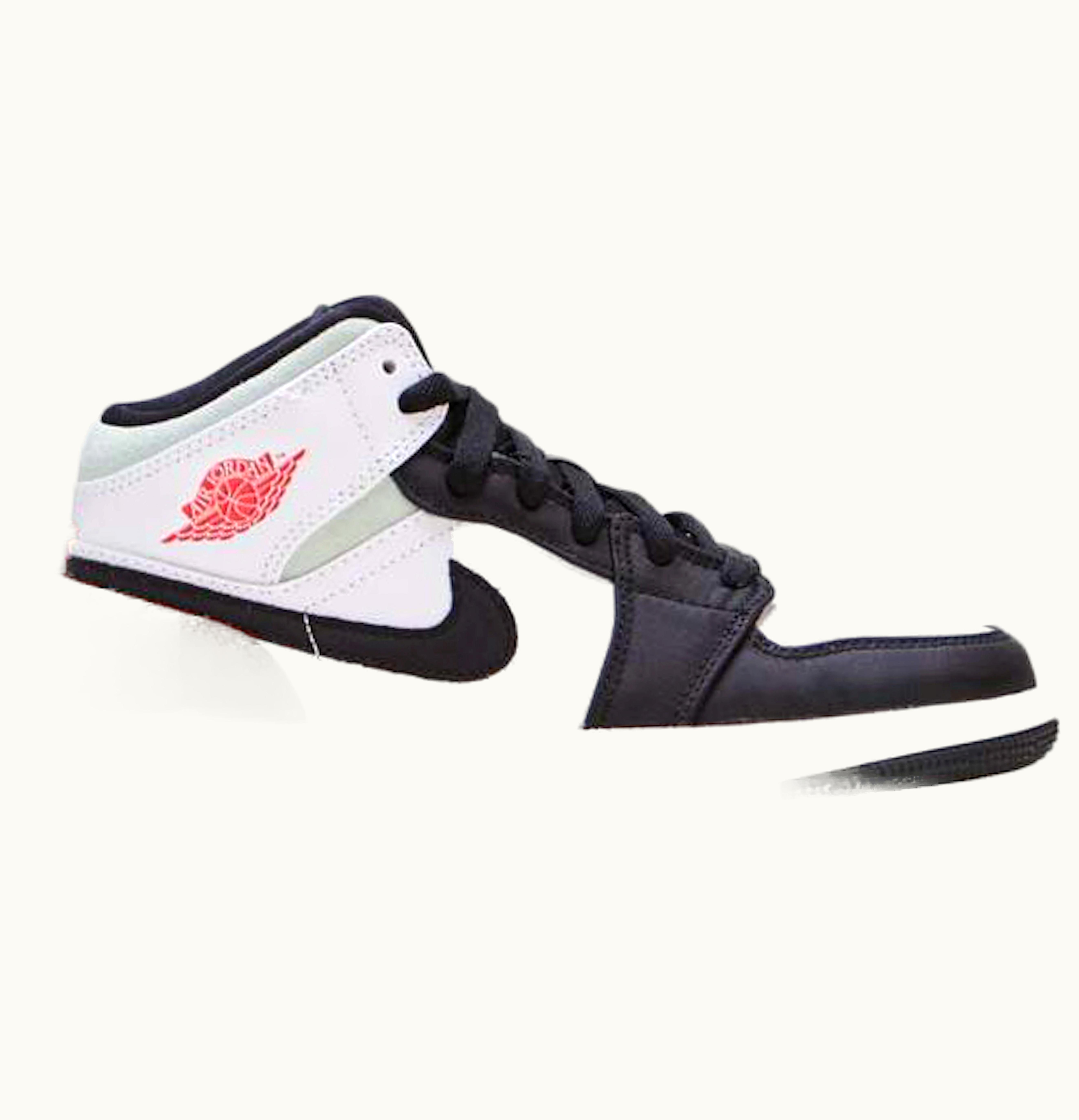 GLINT carries the Jordan 1 Mid SE in White Black Red Spruce for kids. The shoe showcases a leather upper in white, black, and red colors. The base flaunts the standard white panels while black leather overlays cover the toe and eyestays. The Nike "Swooshes" follow the outsole with black shades, while the "Jumpman" and "Air Jordan" logos in red provide additional details to the design. GLINT released the Jordan 1 Mid SE White Black Red Spruce for kids in June 2020, retailing for $100.