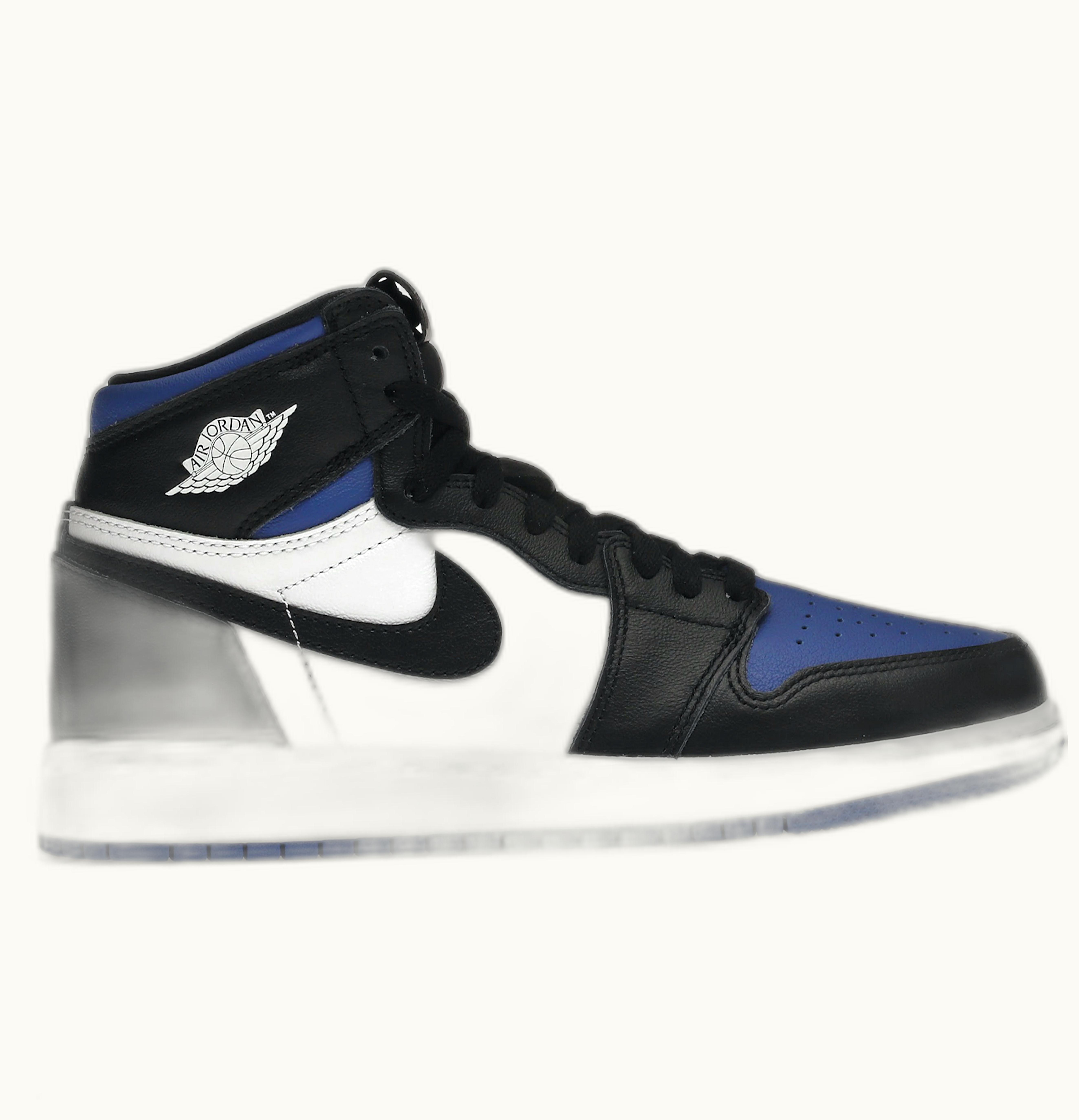 GLINT has the Jordan 1 Retro High Royal Toe (GS) available, which showcases a stylish white and royal blue leather upper complemented by black overlays and textured Swooshes in black. Additionally, the design includes a tapered outsole and a white Air Jordan Wings logo situated close to the heel. The shoe was first introduced in May 2020 and was sold for $170 USD.