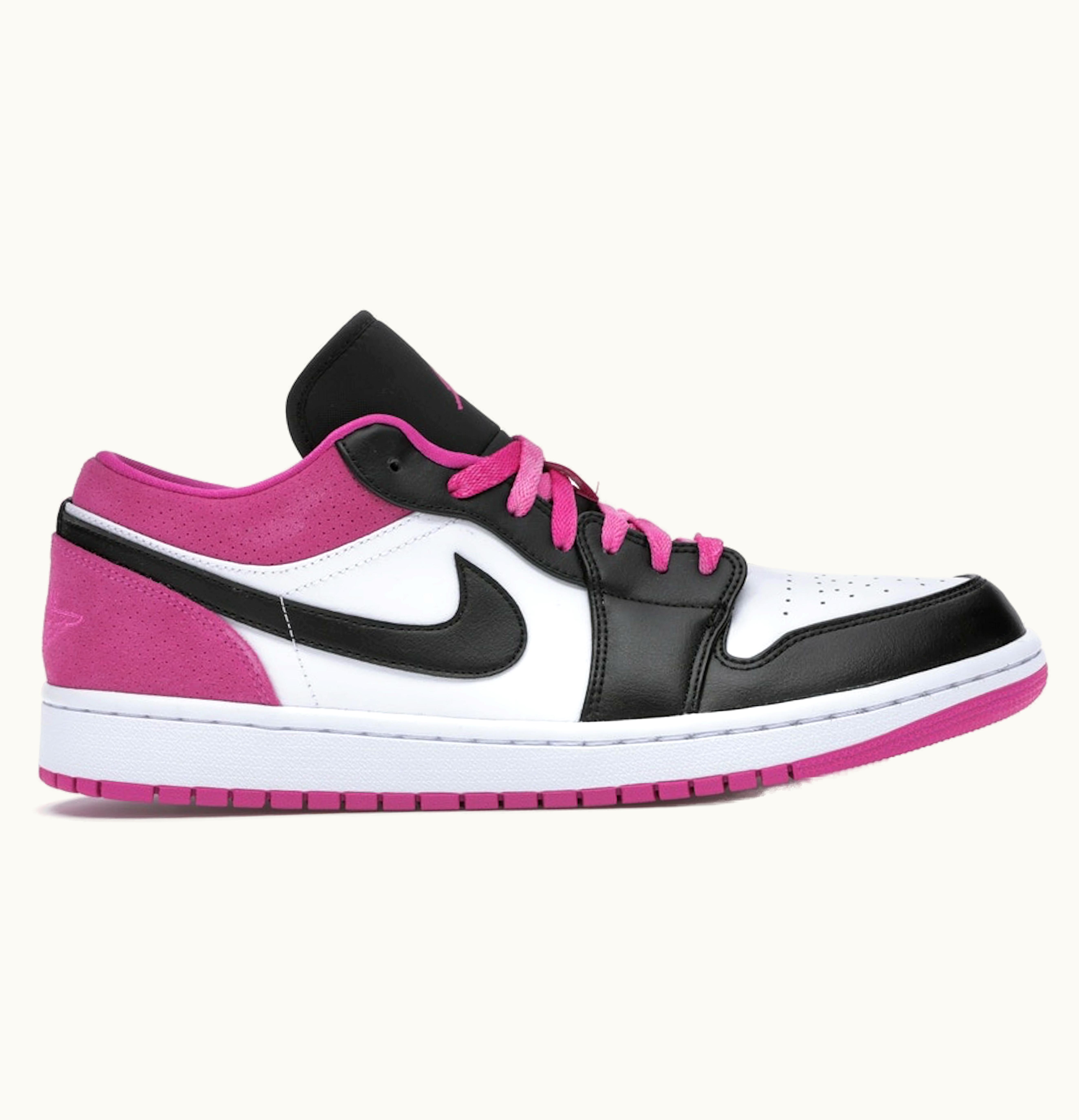 The Jordan 1 Low sneakers in the Black Active Fuchsia colorway are a stylish and comfortable addition to any footwear collection. These sneakers feature a classic low-top silhouette with a sleek black leather upper and contrasting active fuchsia detailing on the Swoosh logo and heel. The durable rubber outsole provides excellent traction and support for all-day wear, while the cushioned insole ensures a comfortable fit. The iconic Jordan wings logo is embossed on the heel to work as a signature touch. These sneakers are perfect for casual wear or for adding a pop of color to your outfit.