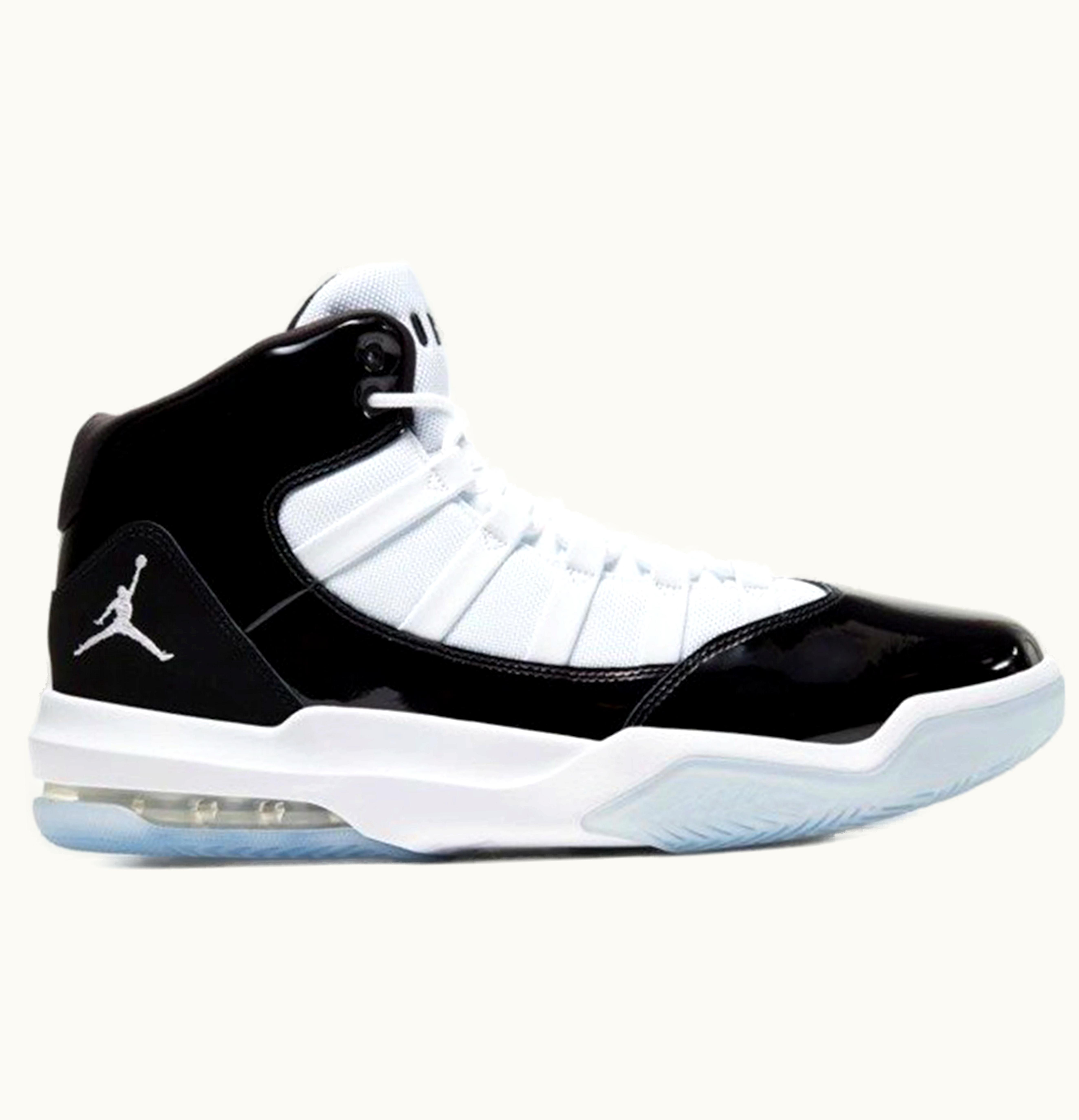 The Jordan Max Aura is a stylish and sleek all-black shoe with white accents on the iconic Jordan Jumpman logo and branding. The upper is made of breathable mesh and durable leather, with perforations for added air flow. The shoe features a comfortable and cushioned midsole, with a visible Air Max unit in the heel for optimal support and shock absorption. The outsole is made of rubber for durability and traction on various surfaces. With its clean and modern design, the Jordan Max Aura is the perfect addition to any sneaker collection.