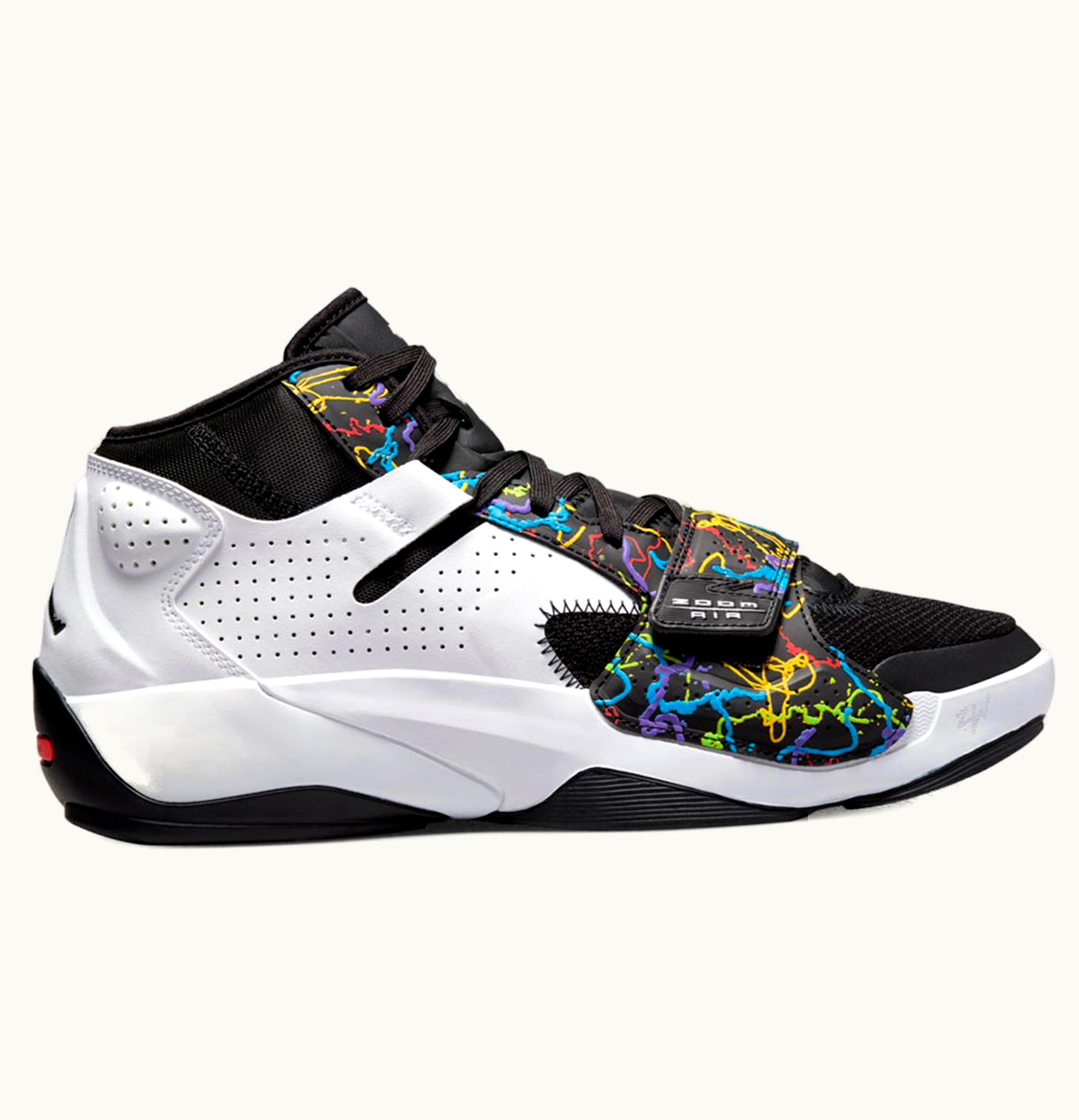 The Jordan Zion 2 Noah White Black Multi-Color is a pair of sneakers designed in collaboration with Zion Williamson, a rising star in the NBA. These sneakers are made with a combination of materials including synthetic leather, mesh, and Zoom Air cushioning for a comfortable, lightweight feel. The white base is accented with black and multi-colored details and features a Noah logo on the tongue as a nod to Zion's Louisiana roots. The outsole is made of durable rubber with a herringbone traction pattern for excellent grip on the court. These sneakers are perfect for basketball players or anyone looking for stylish and supportive footwear.