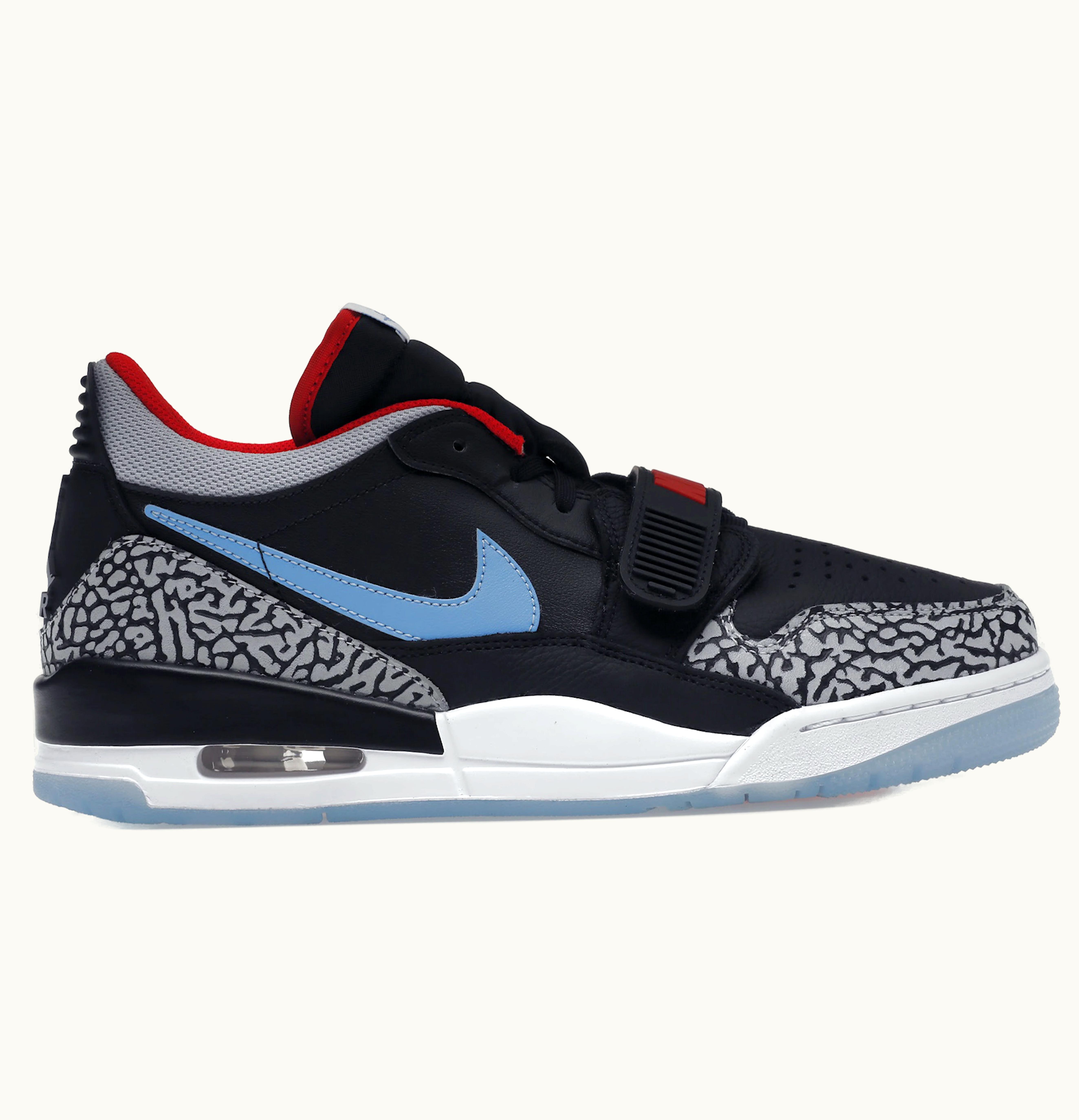 The Jordan Legacy 312 Low Black Valor Blue is a stylish basketball-inspired sneaker designed by the legendary basketball player Michael Jordan. It features a sleek black leather upper with contrasting valor blue accents on the forefoot strap, midsole, and outsole. The shoe also features the iconic Nike swoosh in white on the side, along with a Jumpman logo on the tongue and heel. The midsole is made with Nike Air technology for added cushioning and support to help you stay comfortable during your game. The outsole is made with durable rubber for excellent traction on both indoor and outdoor courts. With its classic design and modern technology, the Jordan Legacy 312 Low Black Valor Blue is perfect for basketball players looking for a stylish and functional shoe.