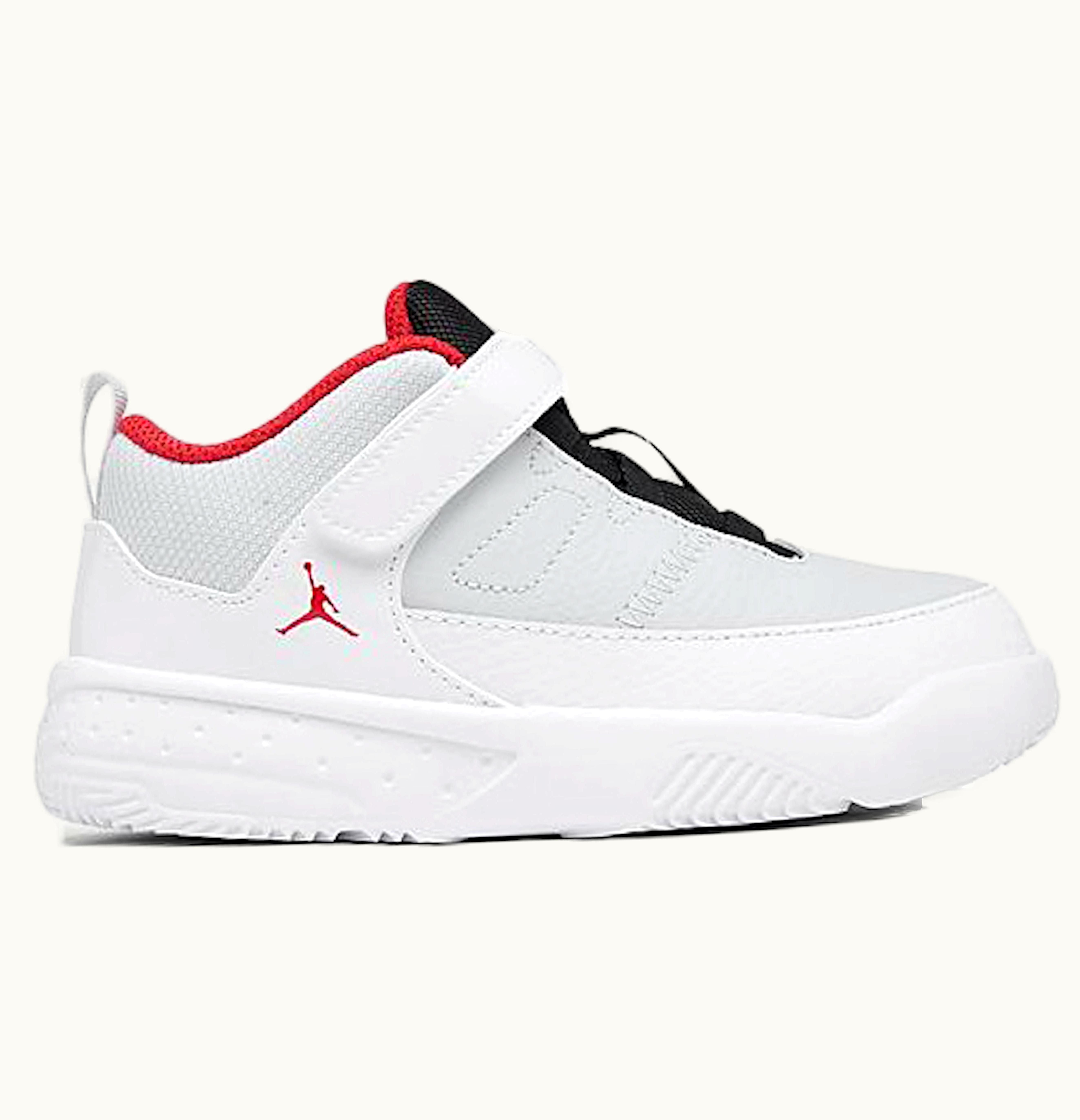 The Jordan Max Aura 3 White University Red (TD) is a trendy and stylish sports shoe designed for infants and toddlers. It features a white leather upper with perforated details and accents of university red on the tongue, laces, and branding. The shoe also has a visible Max Air unit in the heel for exceptional cushioning and comfort. The breathable mesh lining offers increased air circulation, while the padded tongue and collar provide added support and comfort. The rubber outsole delivers outstanding traction, making it perfect for playtime on various surfaces. Overall, the Jordan Max Aura 3 White University Red (TD) is a high-quality shoe that combines style and function, making it a perfect addition to any toddler's shoe collection.