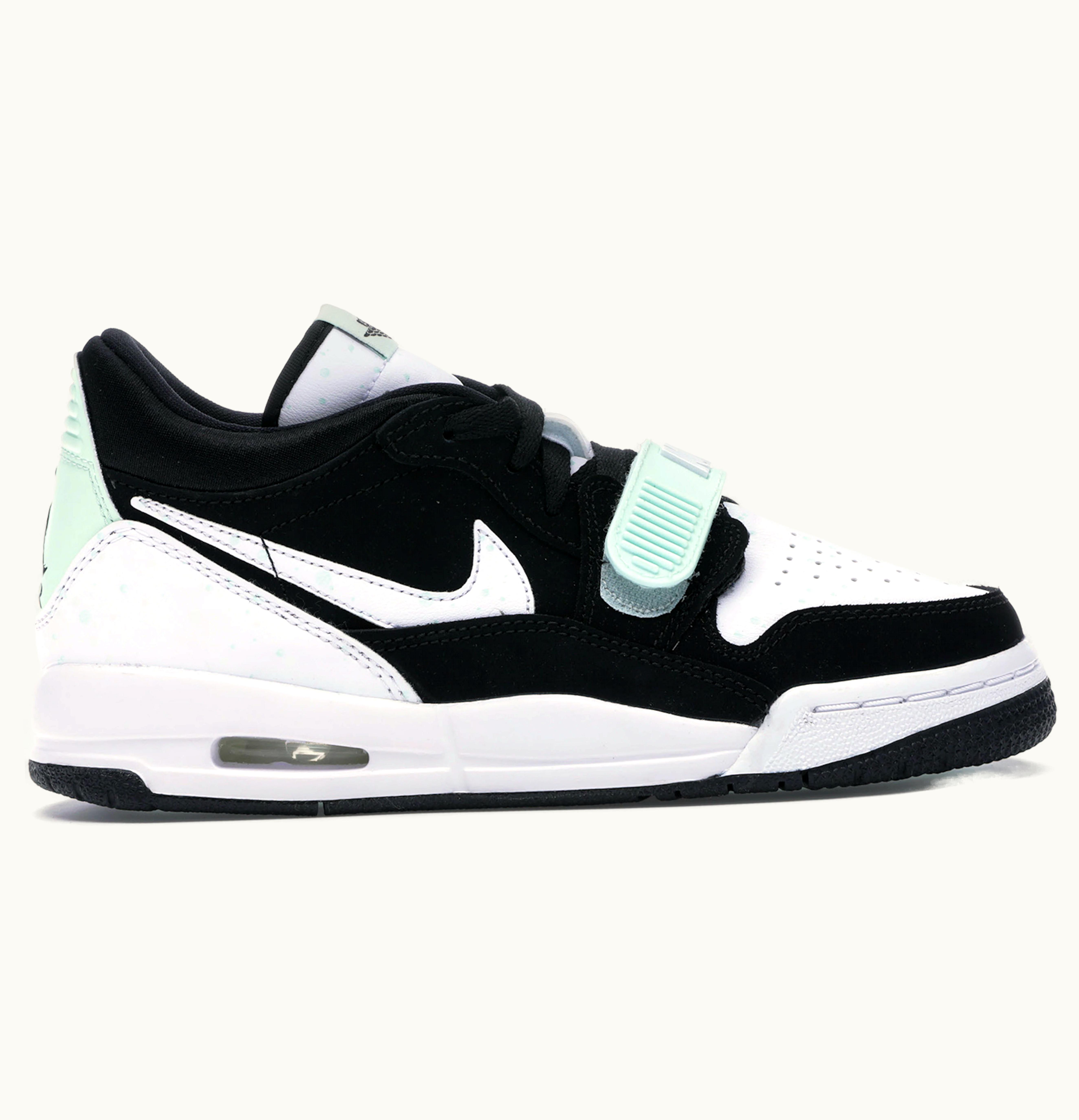 The Jordan Legacy 312 Low Black White Teal Tint (GS) is a stylish and versatile shoe designed for kids who want to stand out on the basketball court or the streets. Featuring a classic low-top silhouette, these sneakers boast a combination of black, white, and teal colors that make them eye-catching and unique. The upper is made of a mix of leather and synthetic materials, providing durability and support, while the breathable mesh tongue and perforations on the forefoot ensure ventilation and comfort. The shoe also has a secure lace-up closure and a padded collar and tongue for a snug and cushioned fit. In terms of performance, the Jordan Legacy 312 Low has a lightweight foam midsole with Zoom Air units in the heel and forefoot that offer responsive cushioning and shock absorption to assist in dynamic movements on the court. The rubber outsole with a circular traction pattern provides excellent grip and durability, making these sneakers suitable for both indoor and outdoor activities. Overall, the Jordan Legacy 312 Low Black White Teal Tint (GS) combines style and function in a versatile shoe that is sure to impress any young basketball enthusiast or sneaker enthusiast.