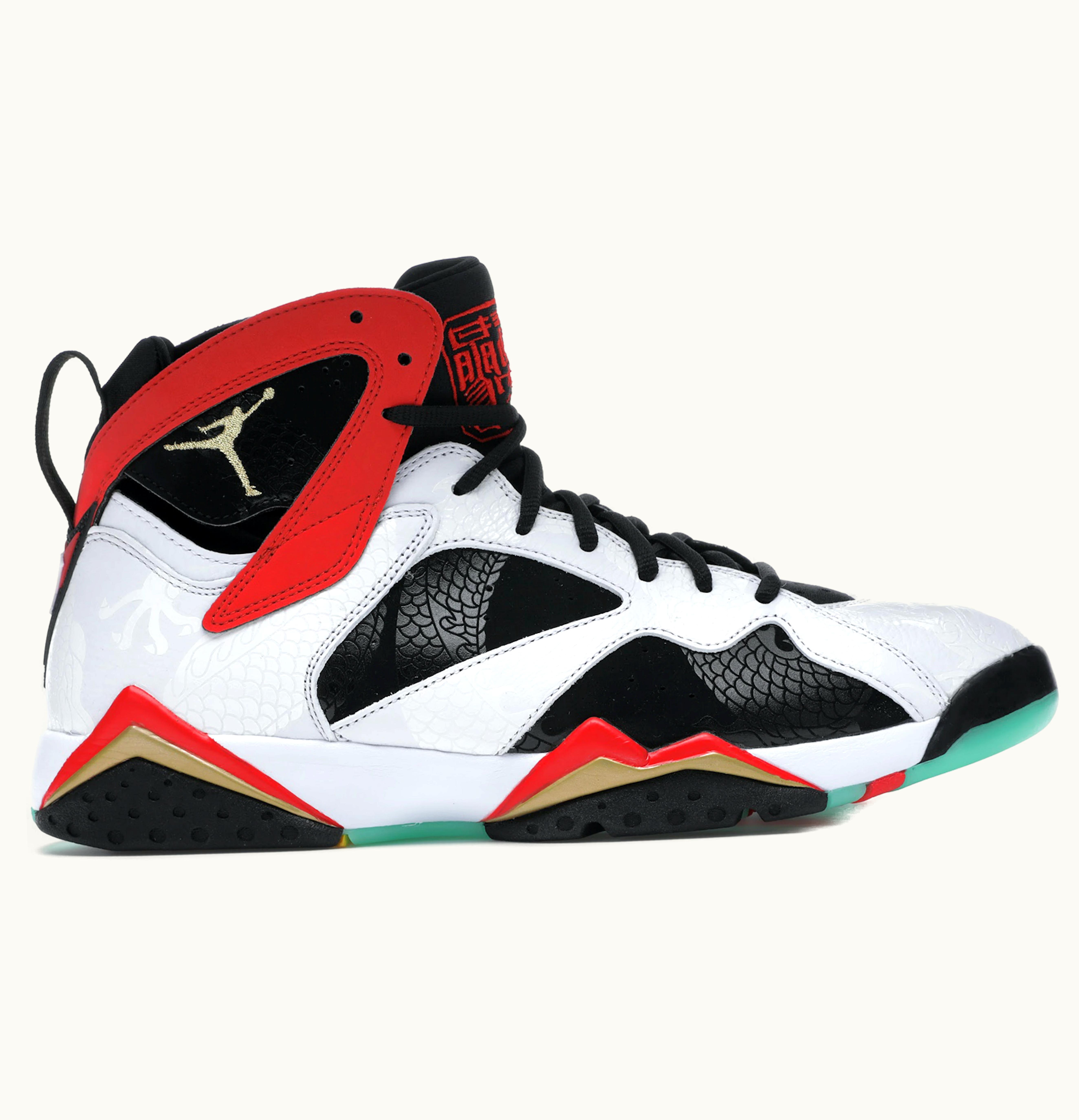 The Jordan 7 Retro Greater China is a premium basketball sneaker that pays tribute to Chinese culture and features intricate embroidery and graphics. The upper is made of a mix of black and gold leather and is accented with green and red detailing on the tongue, heel, and outsole. The insole features a graphic design inspired by traditional Chinese art, and the shoe is finished off with a translucent outsole with a gradient effect. This shoe is not only stylish but also comfortable with its innovative technology that provides enhanced cushioning and support for a smooth ride on the court. Whether you're a basketball player or a sneaker enthusiast, the Jordan 7 Retro Greater China is a must-have addition to your collection.
