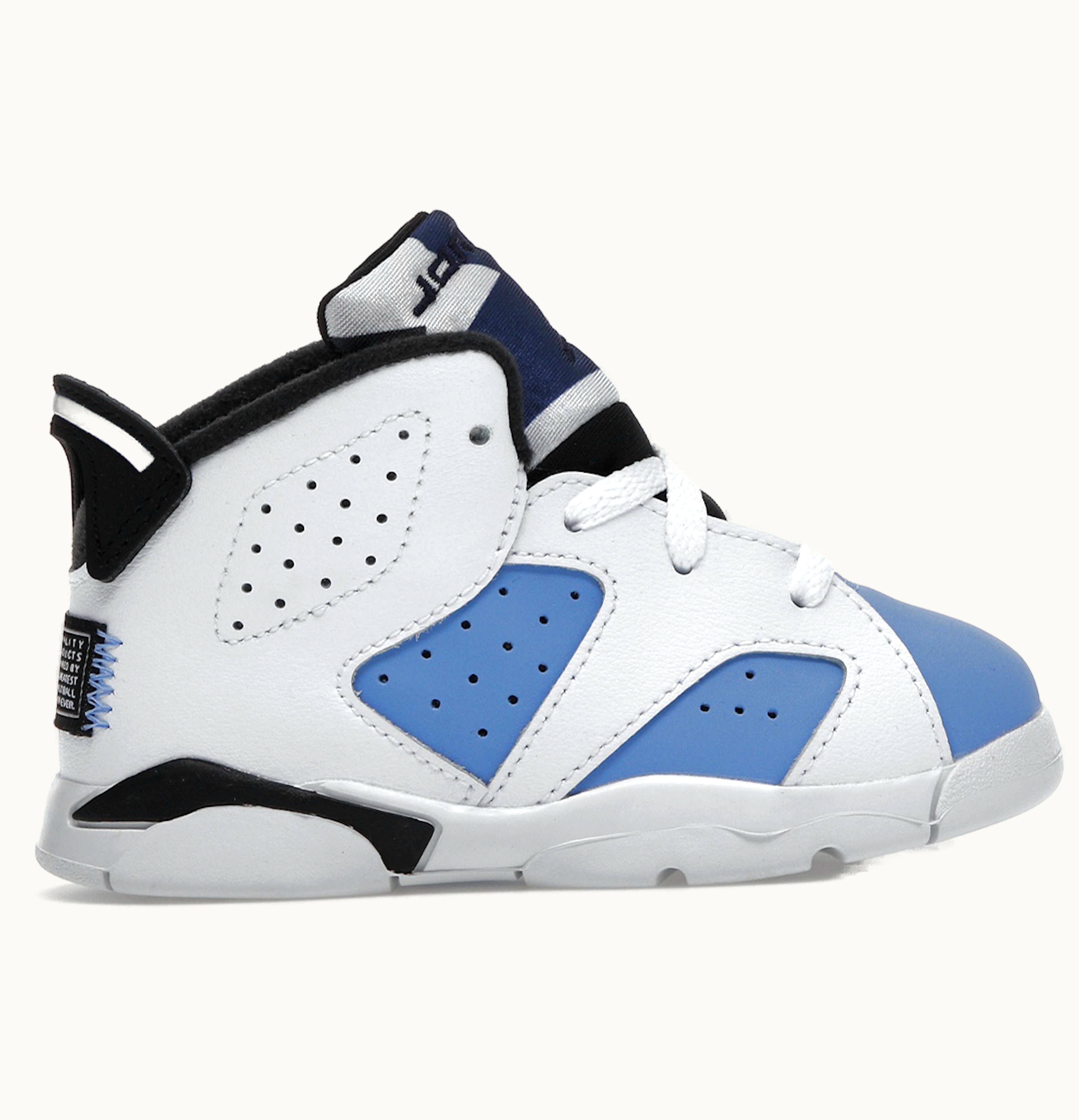 The Air Jordan 6 Retro UNC 2022 (TD) is a perfect addition to your toddler's wardrobe, paying homage to Michael Jordan's alma mater with a familiar colorway. The upper is crafted from university blue nubuck, complemented by white leather overlays, reminiscent of the iconic Carmine 6s. The design also features perforated detailing for breathability and a molded pull tab for easy wear. The branding includes a woven jock tag at the heel and an embroidered Jumpman on the tongue. To ensure a comfortable ride, the shoe is finished with a plush foam sole unit. The Air Jordan 6 Retro UNC 2022 (TD) was released in March 2022 and retails for $70 at GLINT.