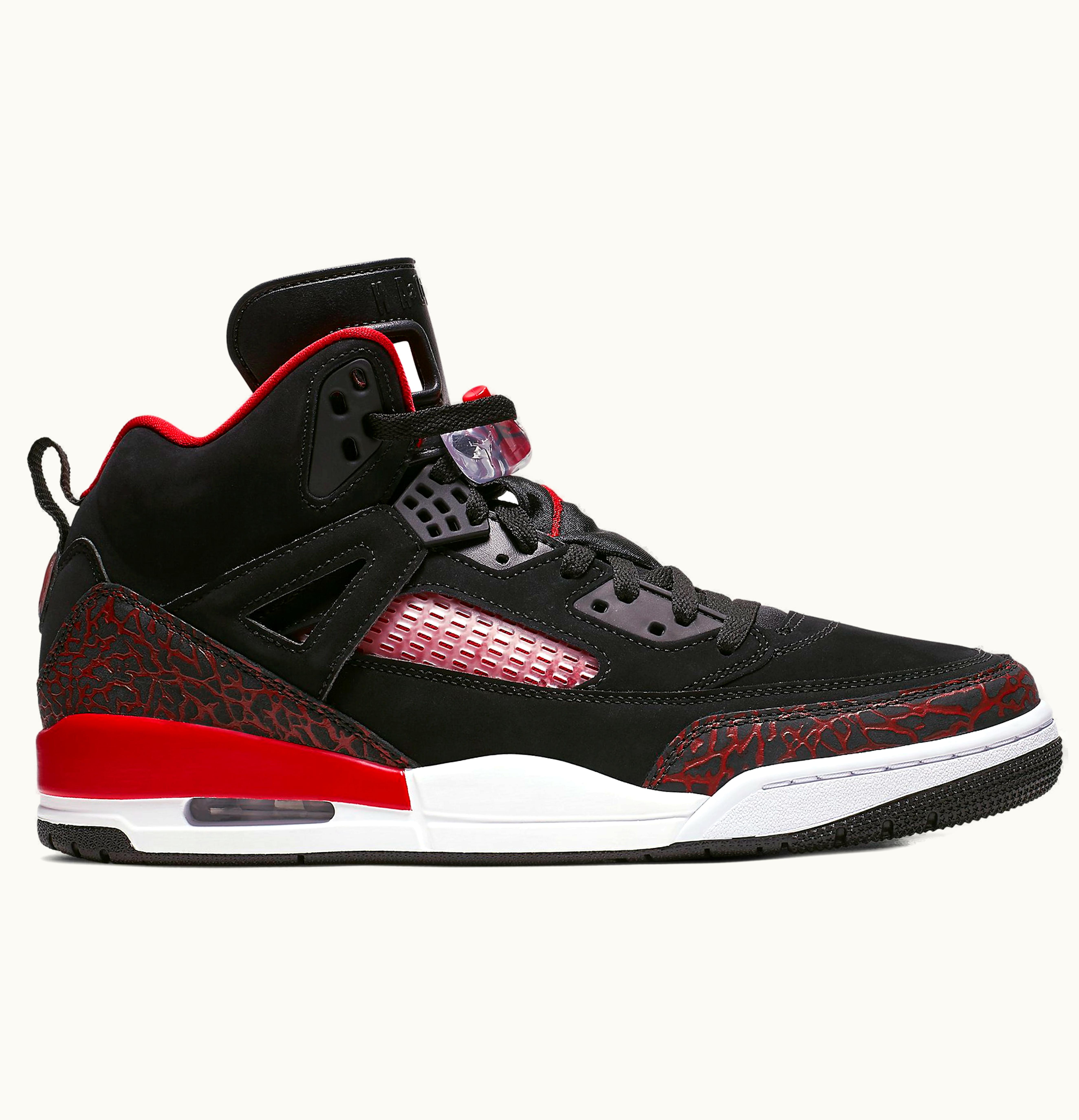 The Jordan Spizike Black University Red is a sleek and stylish sneaker that combines elements from various classic Jordan models. It features a black leather and nubuck upper with red and white accents, as well as a speckled midsole for added flair. The shoe also includes Air-Sole units in the heel and forefoot for superior cushioning and support. The Jordan Spizike is a must-have for any Jordan fan looking for a unique and versatile addition to their sneaker collection.