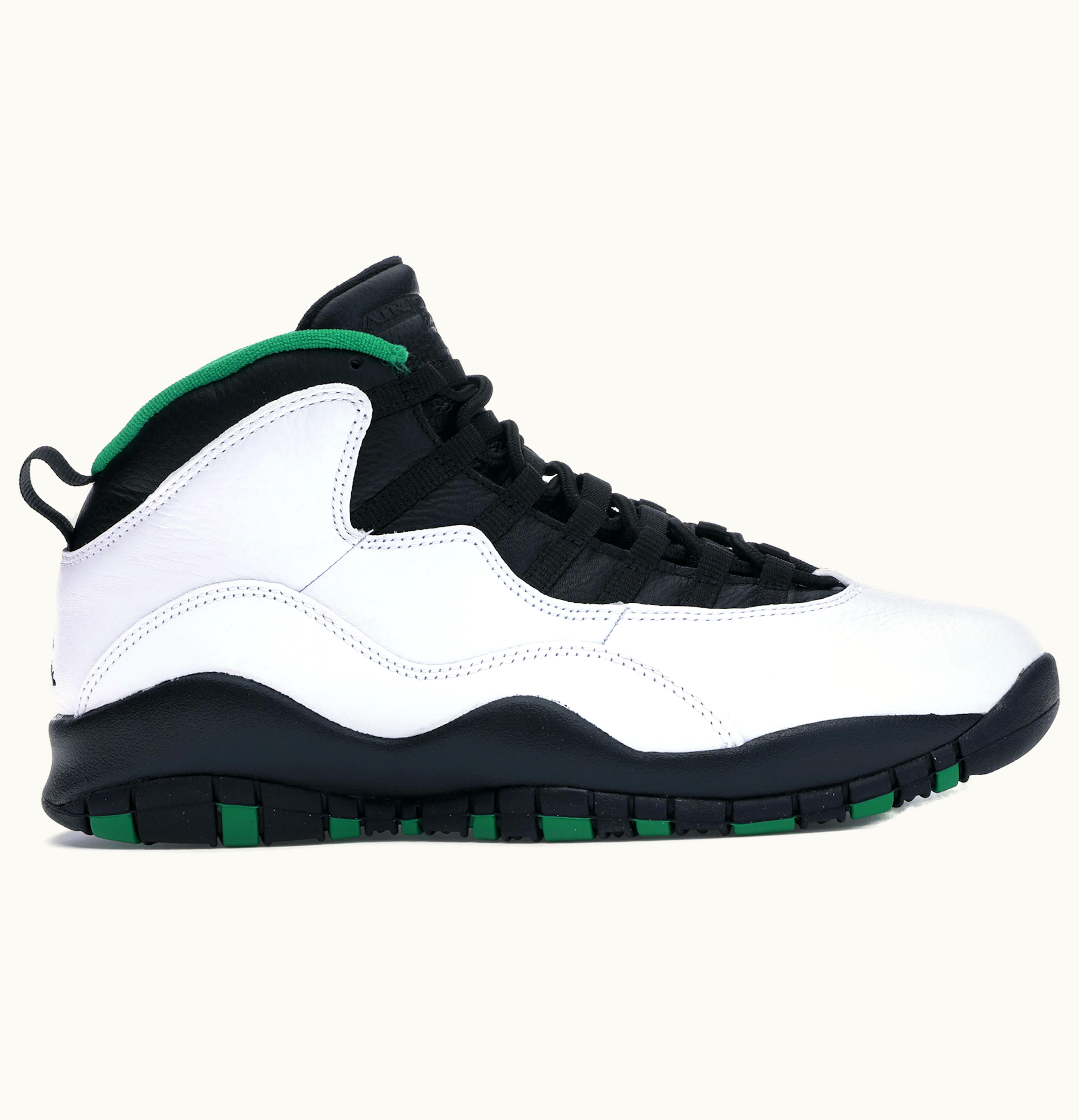 The Seattle-themed Air Jordan 10 Retro showcases a blend of colors including white, black, green, and yellow. Crafted from leather, the upper part of this Retro sneaker boasts a white tone, contrasted by a black tongue, midsole, and ankle collar. The sock liner is adorned with touches of green and yellow, featuring Jumpman printing on the outsole. Additionally, the tongue is debossed with the Jordan branding. The collar lining is inspired by Supersonics' color scheme. GLINT recommends the Air Jordan 10 Retro Seattle to retail for $190 since its launch on 19th October 2019.