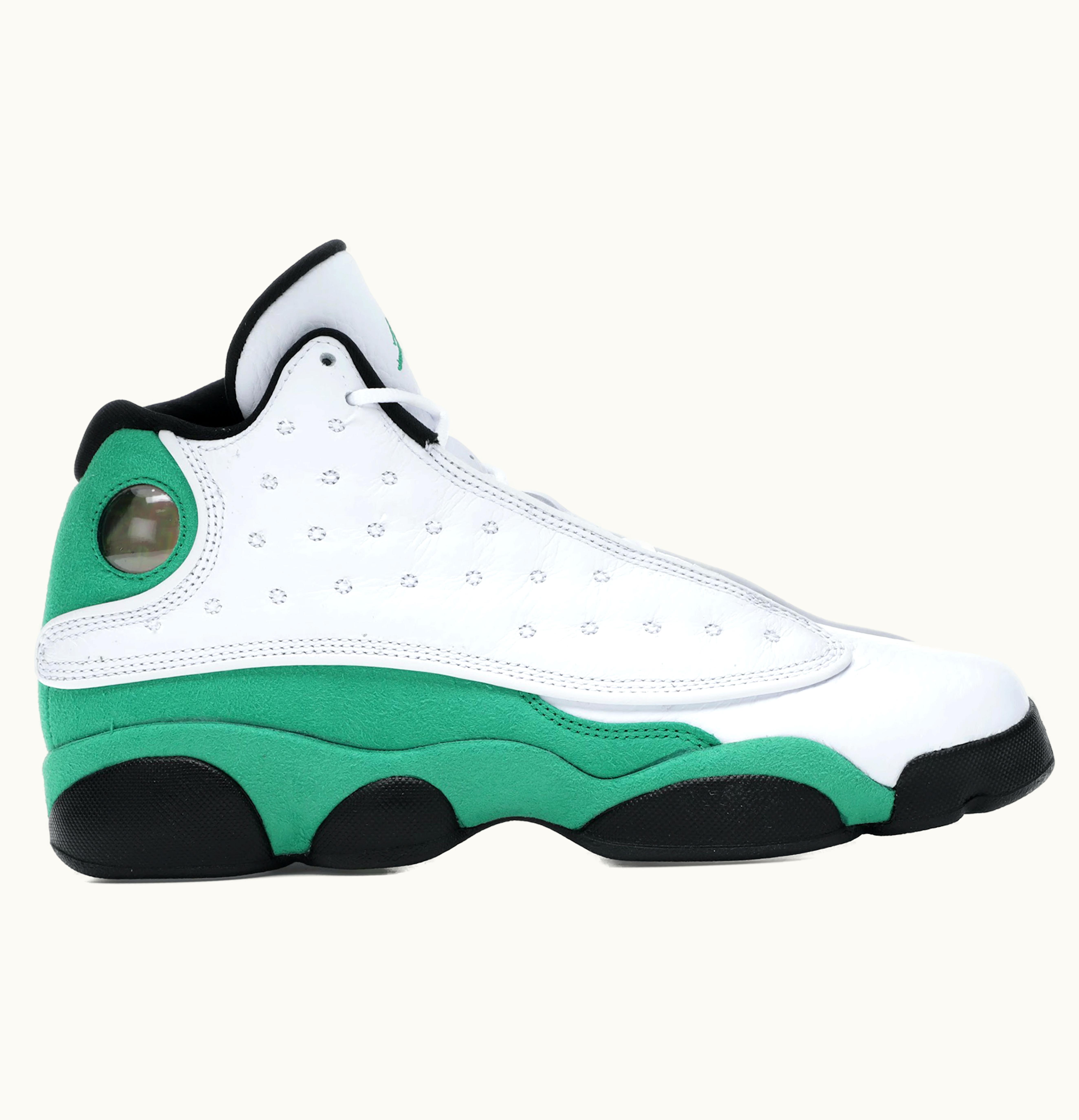 The Jordan 13 Retro White Lucky Green (GS) is a sneaker that combines classic style with modern comfort. It features a white leather upper with black accents on the tongue and heel, while the signature holographic Jumpman logo completes the iconic look. The sneaker also features a lucky green outsole that adds a pop of color and traction to the shoe. With a comfortable Phylon midsole, an Air-Sole unit in the heel, and a rubber outsole, this shoe is perfect for anyone who wants a stylish and comfortable sneaker that can be worn for any occasion. Whether you're hitting the court or just looking for a fresh pair of sneakers to wear around town, the Jordan 13 Retro White Lucky Green (GS) is an excellent choice.