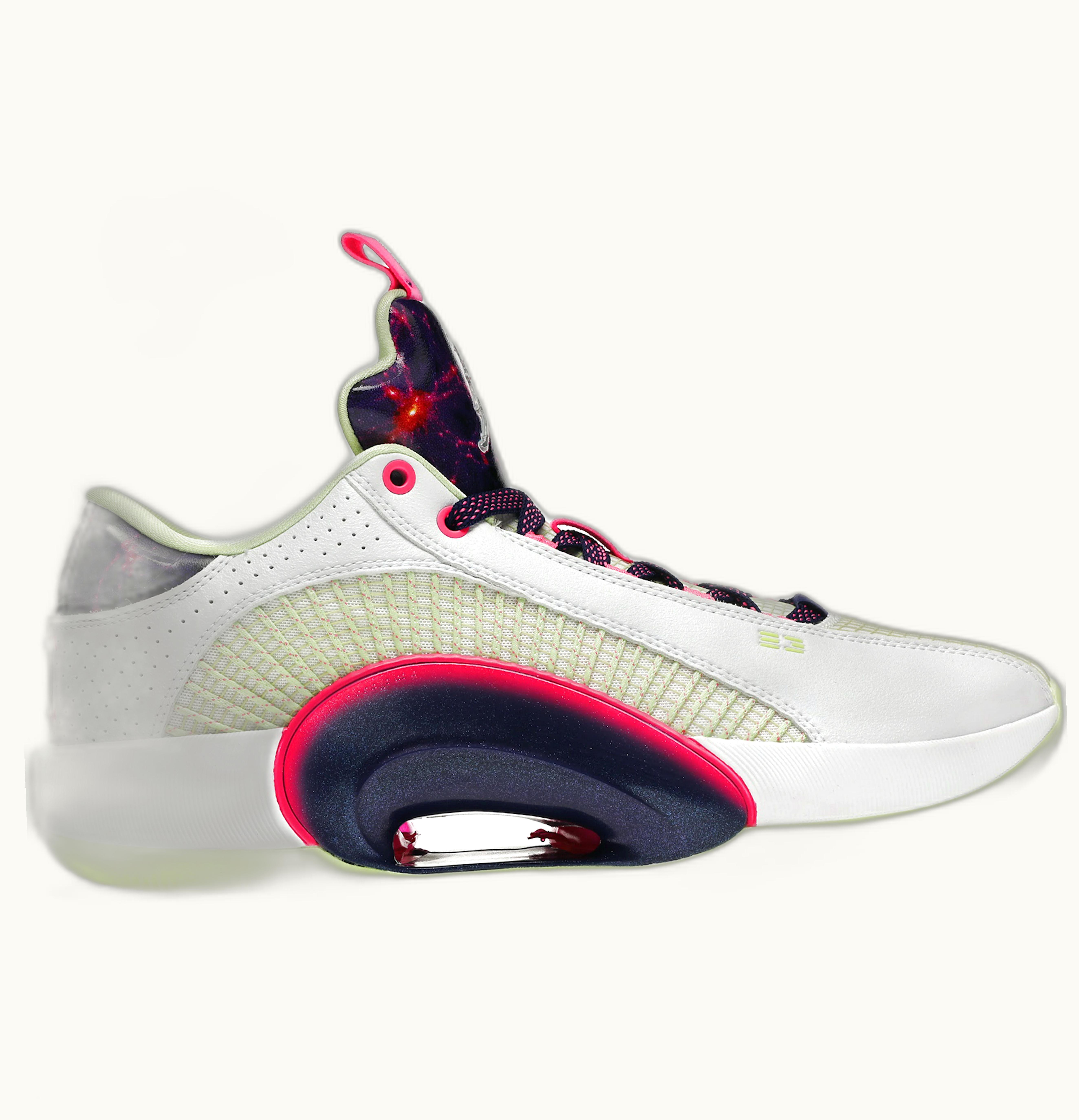 A new colorway of the Jordan 35 sneakers has been launched in honor of Jordan athlete Luka Dončić. The Air Jordan 35 Low Cosmic Deception features an otherworldly color palette to celebrate Dončić's exceptional skills and basketball IQ. The sneakers flaunt galaxy patterns on the tongue and heel wrap, in a combination of white, Iridescent, and purple hues. Additionally, the pro model also highlights Jumpman and Luka Dončić logos on the tongue. GLINT is now offering the Air Jordan 35 Cosmic Deception since its May 2021 release, with a retail price of $175.