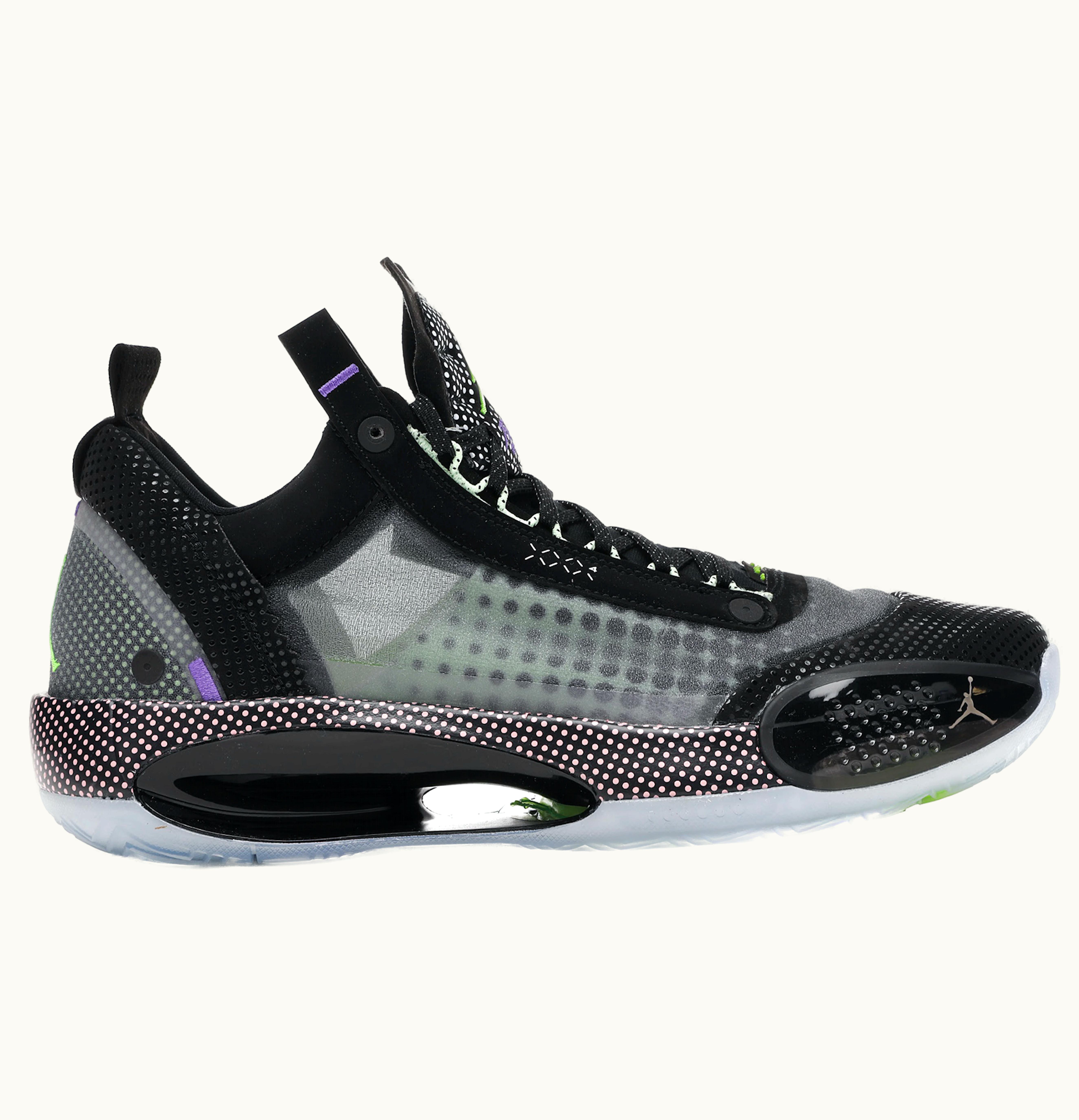 The Jordan XXXIV Low Black Vapor Green Bleached Coral is a stylish and modern basketball shoe that features a sleek low-top design in a combination of black, vapor green, and bleached coral colors. The shoe is made with premium materials such as a lightweight mesh upper, Zoom Air cushioning in the forefoot and heel, and a durable rubber outsole with herringbone traction pattern for supreme grip. The unique design of the shoe offers responsive support and stability for quick change of direction and explosive jumps, making it a perfect choice for basketball players. The signature Jumpman logo can be found at the tongue and along the side panel of the shoe, ensuring that you are wearing a high-quality and authentic Jordan product.