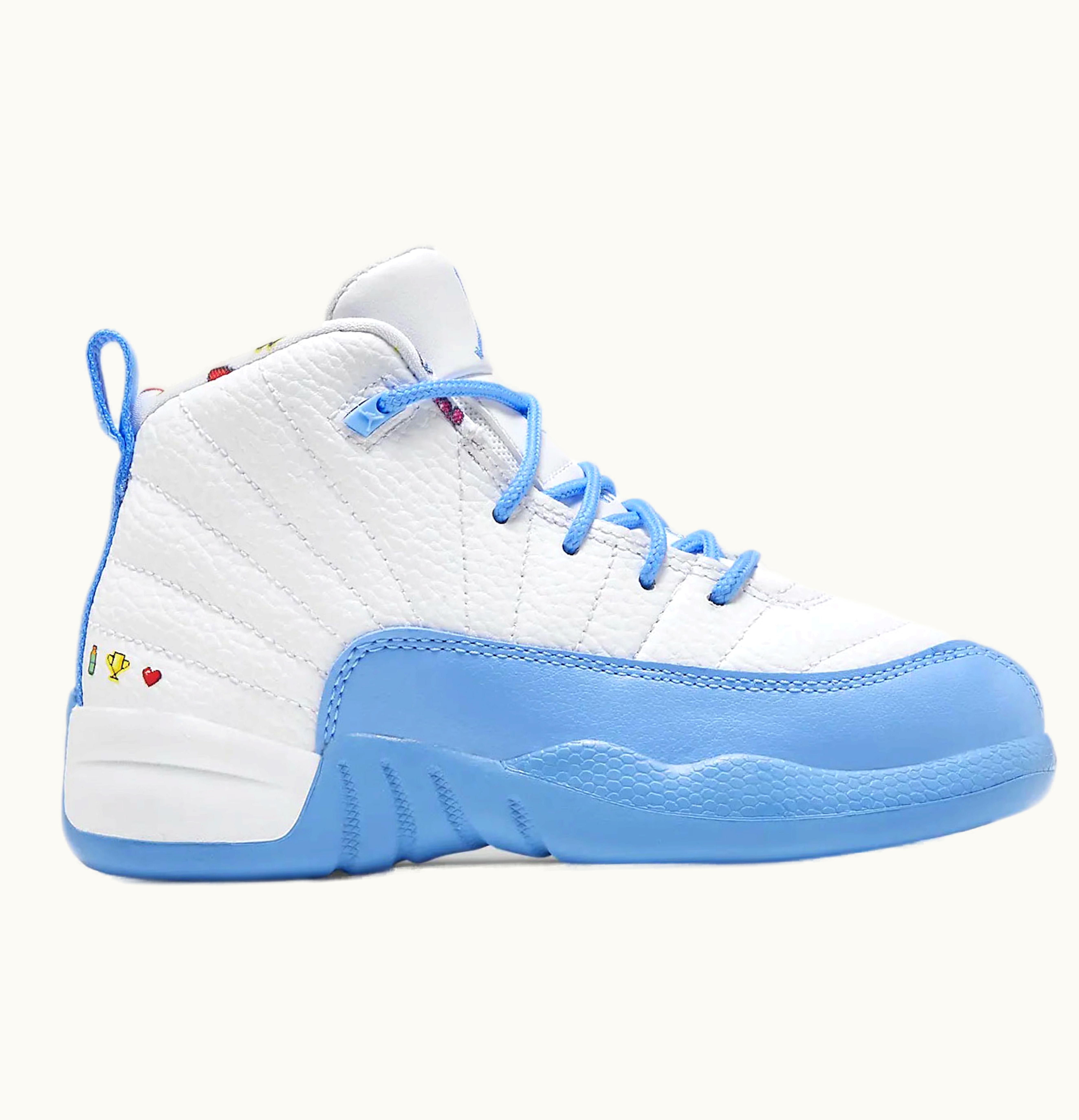 The Jordan 12 Retro Emoji (PS) is a stylish and fun shoe that is designed for kids. This shoe features a white leather upper with various emoji prints in black, blue, and yellow. The iconic Jumpman logo is featured on the tongue and heel, and the sole is made of durable rubber for excellent traction. With its comfortable fit and playful design, the Jordan 12 Retro Emoji (PS) is perfect for kids who want to express their personalities on and off the court.