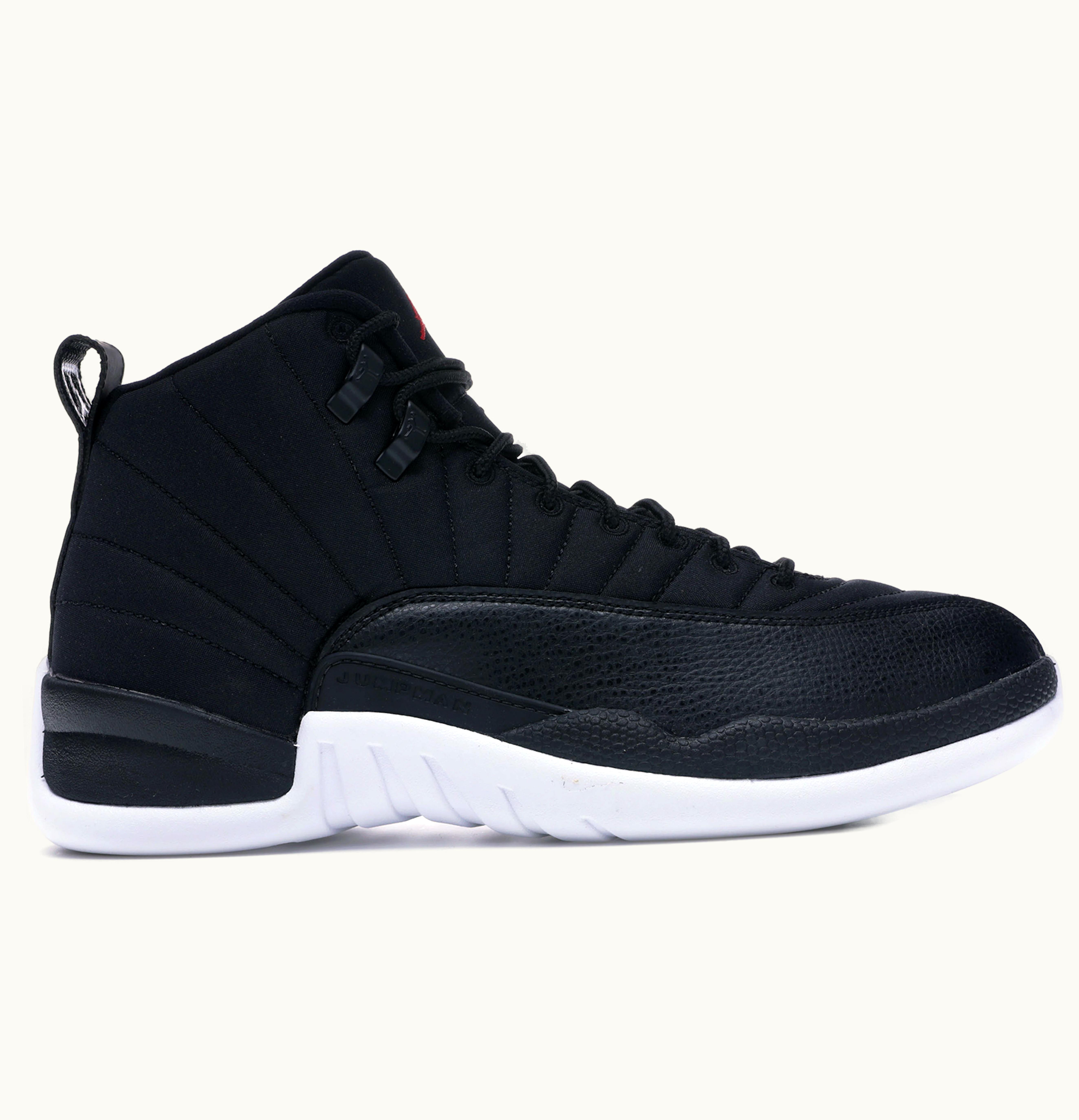 The Jordan 12 Retro Nylon sneakers are a classic pair of basketball shoes with a unique twist. The upper of the shoe is constructed with a black nylon material, giving it a lightweight and breathable feel. The overlays are made with durable leather in a sleek black colorway. The tongue and heel pull tabs feature the iconic Jumpman logo, adding to the retro style. The cushioned sole of the shoe provides ultimate comfort for all-day wear, while the rubber outsole offers traction and durability on the court. The herringbone pattern on the outsole allows for quick cuts and agile movements on the court. These Jordan 12 Retro Nylon sneakers are a must-have for any basketball player or sneaker collector looking to add a classic pair of shoes to their collection. They offer a contemporary look with nods to the past, making them perfect for on or off the court.