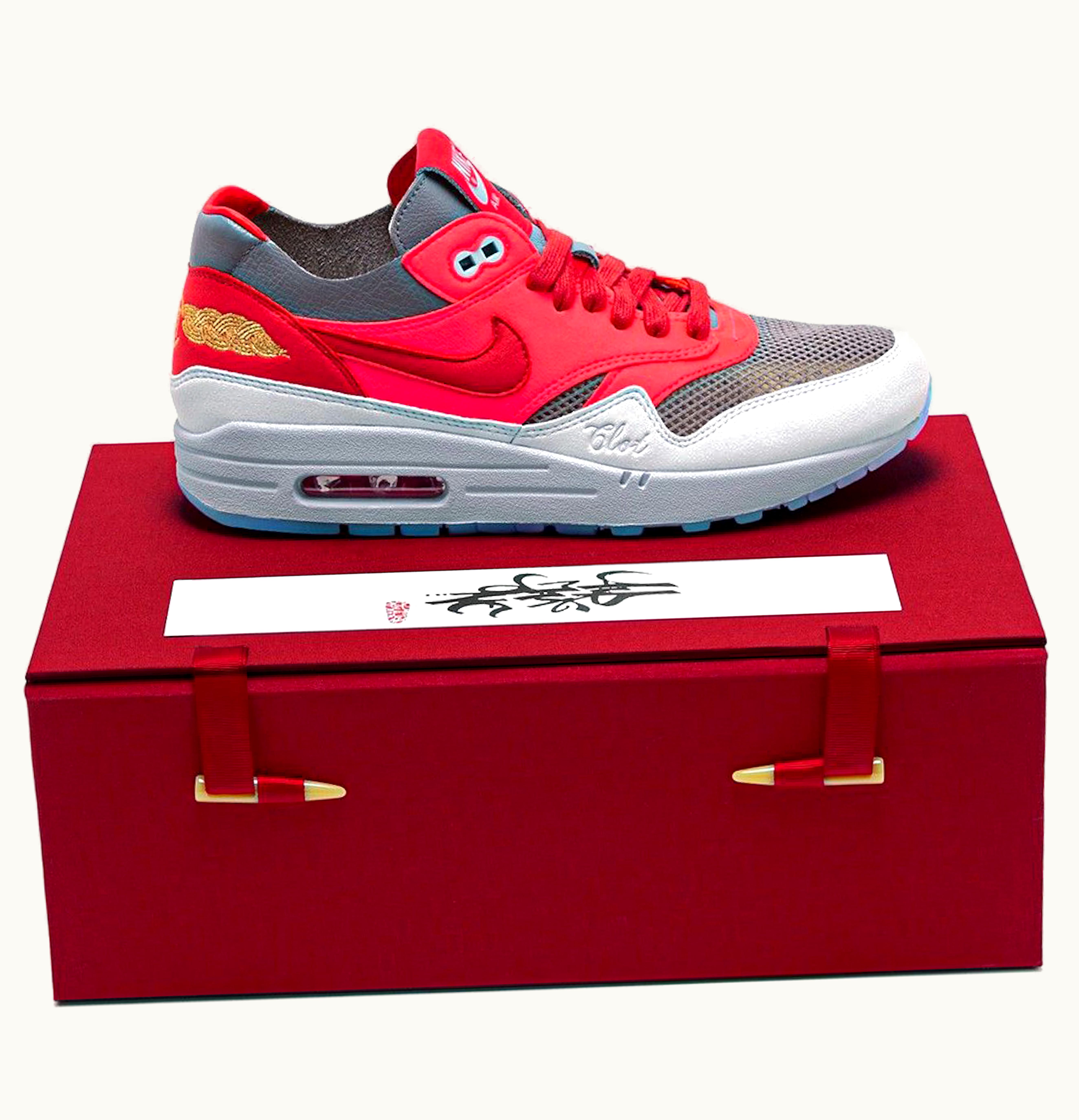The Nike Air Max 1 CLOT Kiss of Death Solar Red (Special Box) is a limited edition sneaker collaboration between Nike and CLOT, a streetwear brand based in Hong Kong. This sneaker features a striking solar red and black colorway, with contrasting white detailing on the midsole and Swoosh logo. The upper is crafted from a combination of suede and mesh for breathability and comfort, while the signature Air Max cushioning provides superior support and impact-absorption. The Kiss of Death graphics and branding pay homage to Chinese culture and traditional medicine, adding a unique and eye-catching element to the design. Additionally, this special box release comes with a custom sneaker bag and packaging, making it a must-have for any collector or fan of streetwear fashion. Designed for both style and performance, the Nike Air Max 1 CLOT Kiss of Death Solar Red (Special Box) is a standout sneaker that is sure to turn heads wherever you go.