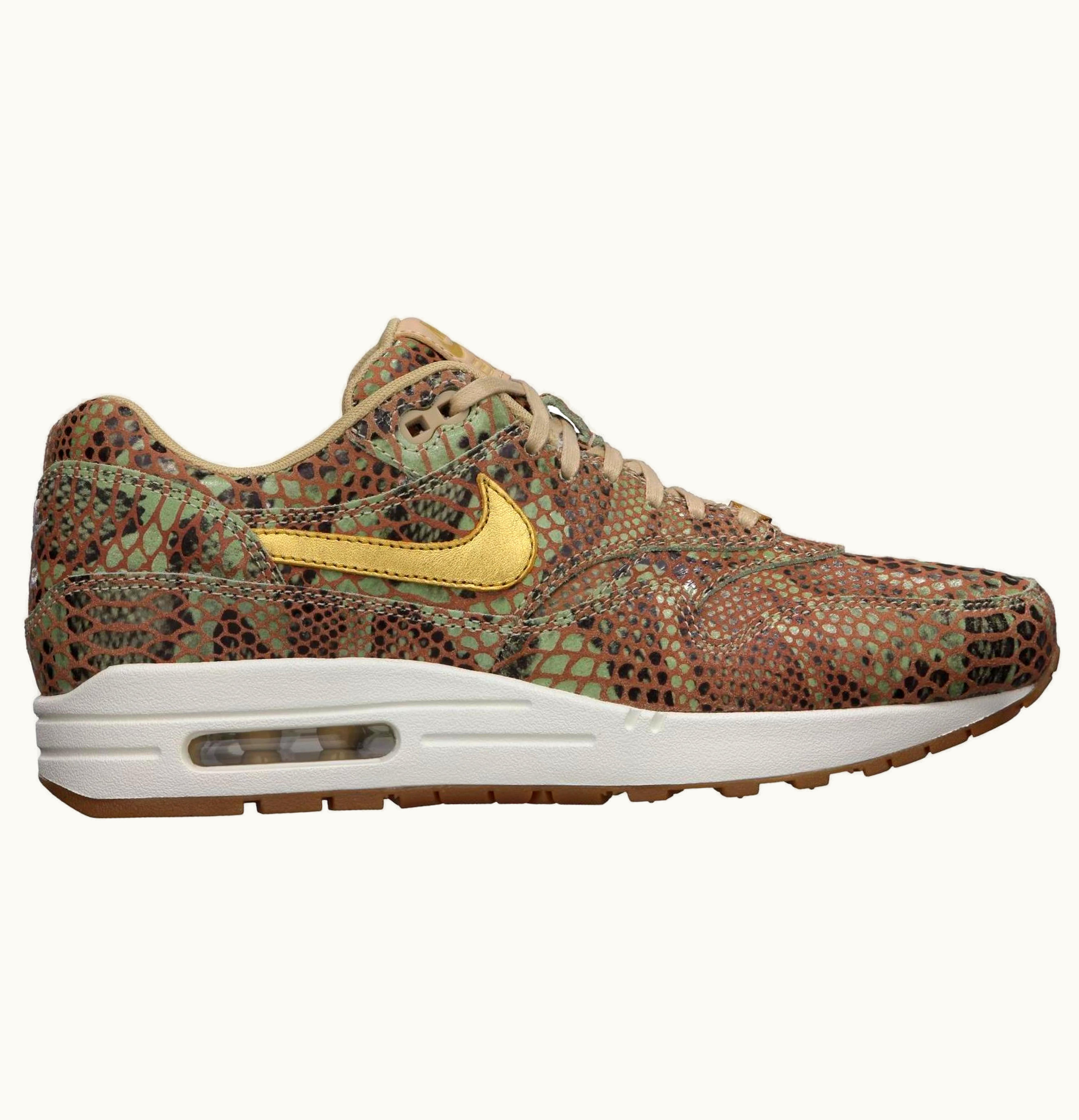 The Nike Air Max 1 Year of the Snake (W) is a limited edition release of the classic Air Max 1 silhouette, designed specifically for women. The shoe features a sleek black and metallic gold colorway, inspired by the Chinese zodiac snake, with snakeskin-textured leather overlays and a subtle snake graphic embossed on the heel. The upper is constructed with a combination of premium materials, including leather, suede, and mesh, for a comfortable and durable wear. A visible Max Air unit in the heel provides responsive cushioning and impact protection, while the rubber outsole with waffle-inspired tread pattern delivers excellent traction. Additional details include a soft foam tongue for added comfort, Nike branding on the heel and tongue, and a woven tag featuring the Chinese character for "snake". This shoe is a must-have for sneaker enthusiasts and collectors, and a great way to celebrate the Year of the Snake in style.