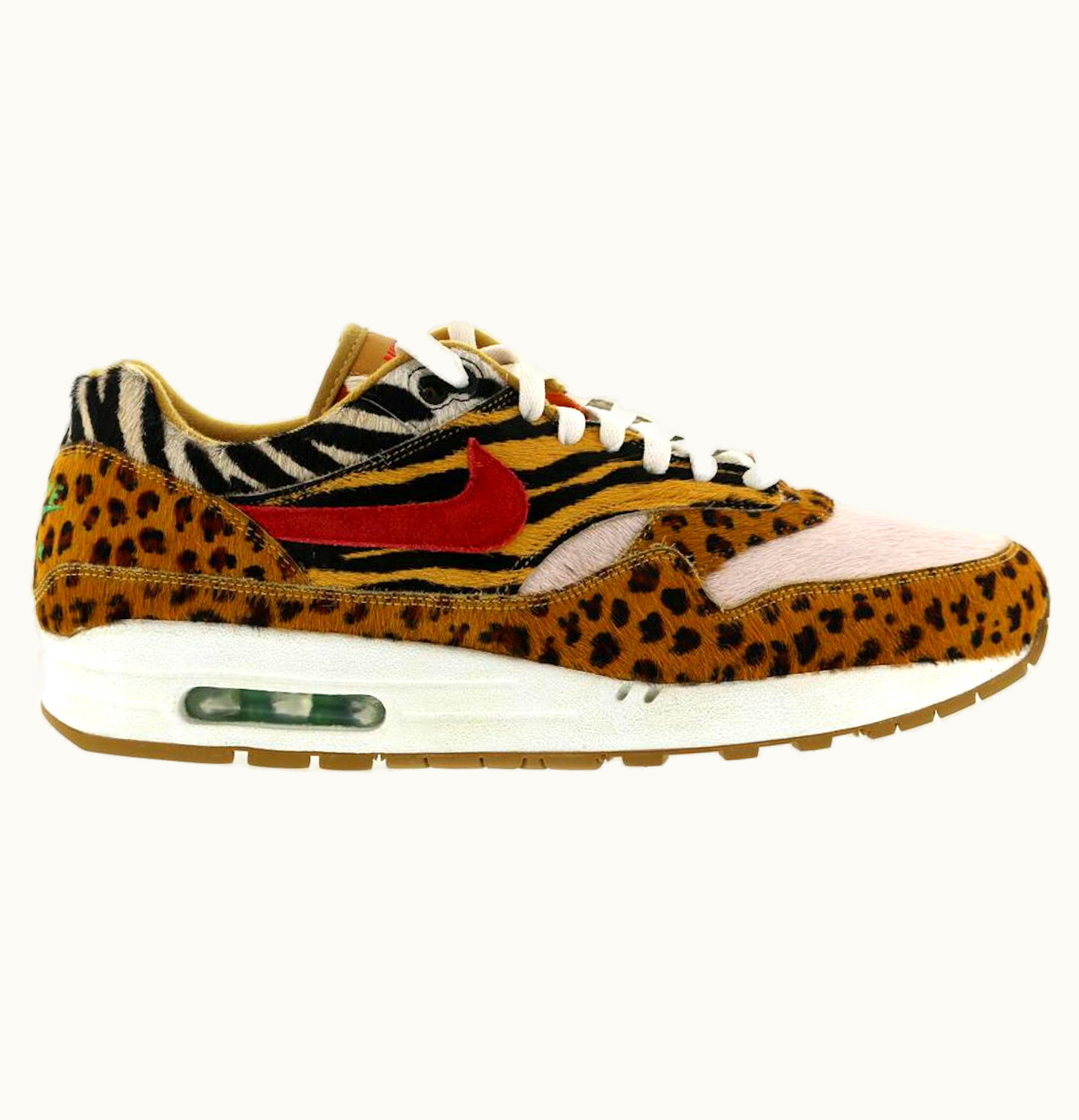 The Nike Air Max 1 Animal Pack is a sneaker that combines distinct animal prints to create a unique and eye-catching design. The upper of the shoe is made from a combination of premium leather, suede, and textured fabrics, with animal prints featured throughout. The midsole is made from durable foam that provides a springy, cushioned feel with each step, while the Air Max unit in the heel offers extra cushioning and shock absorption. The sneaker also features a padded collar and tongue for added support and comfort. With its bold design and high-quality construction, the Nike Air Max 1 Animal Pack is a must-have for any sneaker collection.