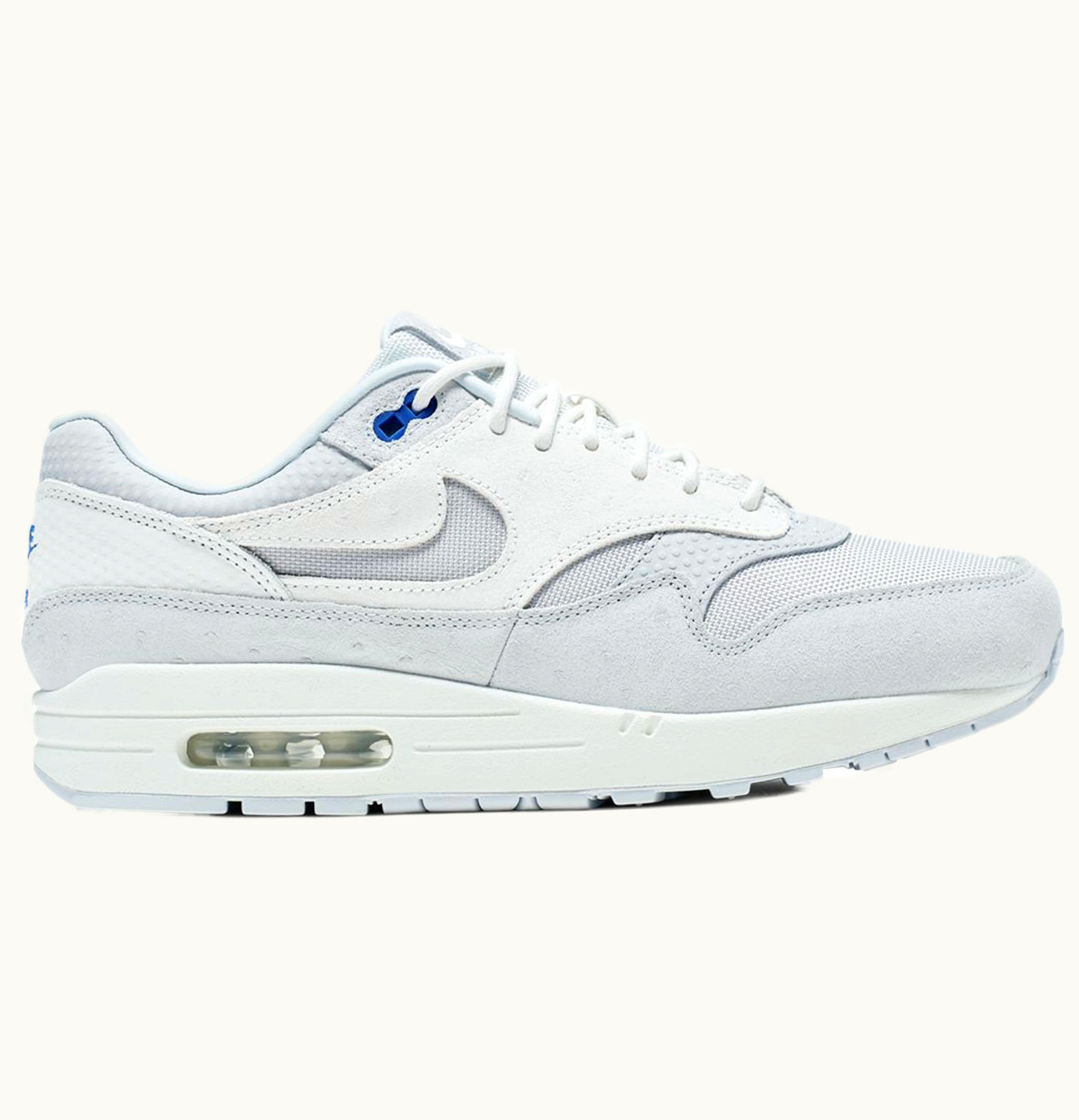 The Nike Air Max 1 Pure Platinum Racer Blue is a stylish and comfortable sneaker designed for both casual wear and athletic performance. Made with a sleek pure platinum leather and mesh upper, this shoe provides superior breathability and durability. The blue detailing adds a pop of color, while the iconic Nike Swoosh on the side adds a touch of branding. The Air Max cushioning system in the heel provides unparalleled comfort and support, ensuring that you can wear these shoes all day without discomfort. With a rubber outsole that offers ideal traction and durability, the Nike Air Max 1 Pure Platinum Racer Blue is the perfect choice for those looking for a high-performance sneaker that also looks great.
