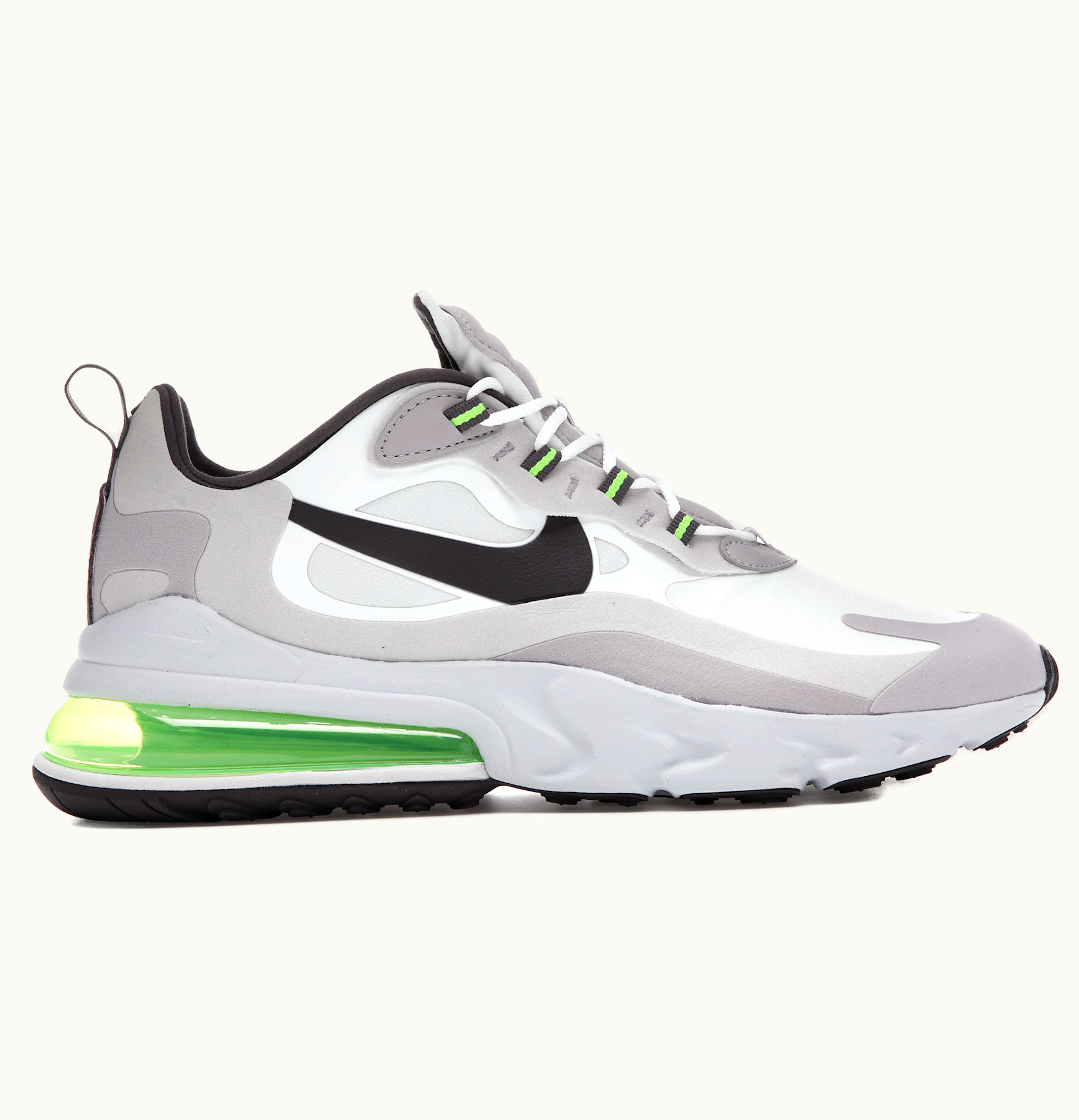 The Nike Air Max 270 React Vast Grey is a fashionable and comfortable lifestyle shoe with a sleek design. The upper features a combination of breathable mesh and synthetic materials, which allows for durability and flexibility. The shoe's colorway, consisting of light grey, white, and black hues, provides a subtle yet trendy appearance that can be worn with various outfits. The Nike Air Max 270 React Vast Grey also boasts a visible Max Air unit in the heel, which provides lightweight cushioning and responsive energy return. The shoe's foam midsole is complemented with a React technology, which enhances comfort and support. Finally, the Nike Air Max 270 React Vast Grey has a rubber outsole with a waffle traction pattern, ensuring durable and secure grip on various surfaces. Overall, the Nike Air Max 270 React Vast Grey is a stylish and comfortable shoe perfect for everyday wear.