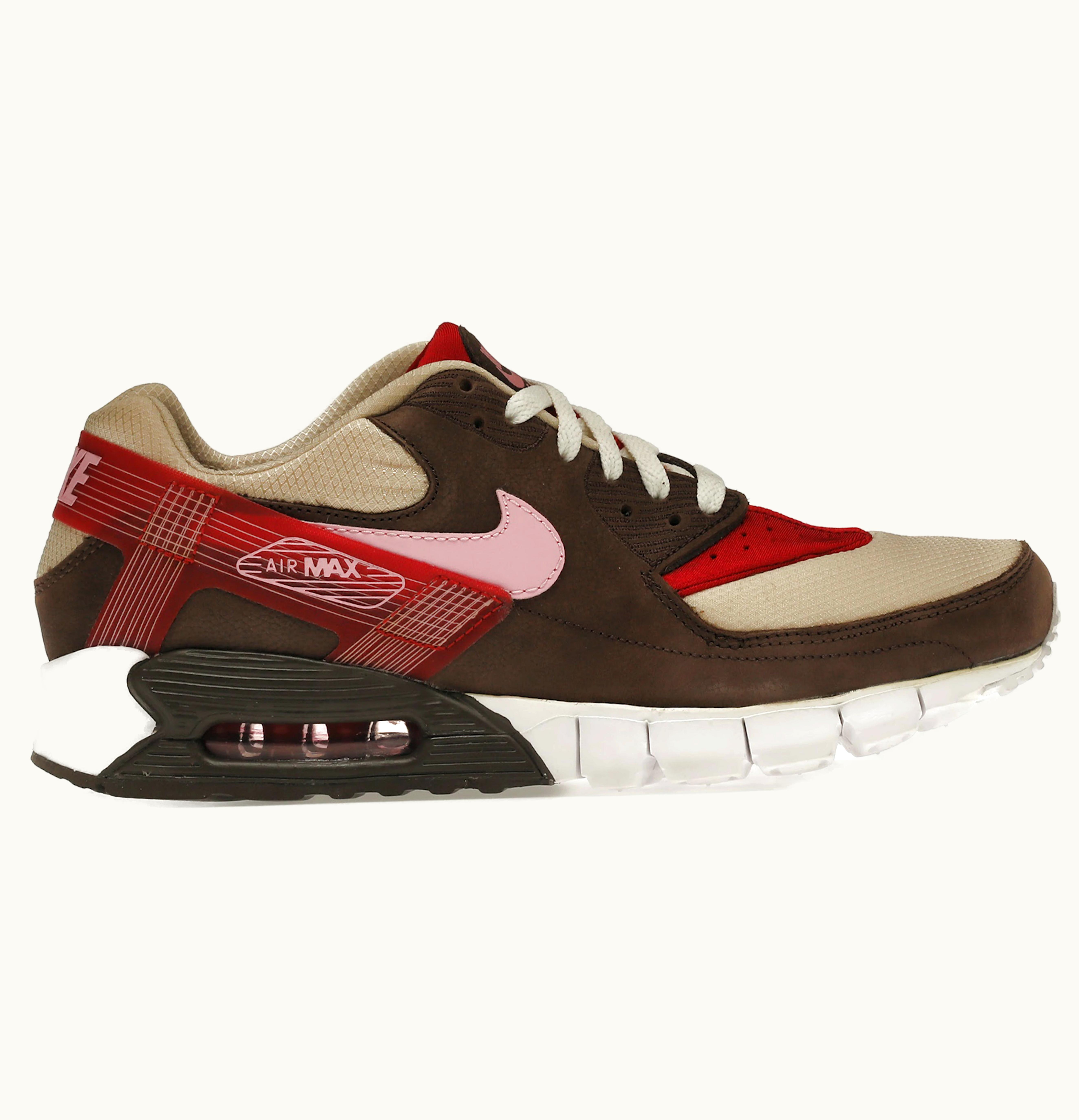The Nike Air Max 90 Current Huarache DQM Bacon is a limited edition sneaker that is a collaboration between Nike and Dave's Quality Meats (DQM). The shoe is inspired by the bacon and egg breakfast dish and features a colorway that resembles the colors of bacon. It has a premium leather upper with a suede mudguard and a synthetic leather overlay. The shoe also has a neoprene bootie for a snug fit and a visible Air Max unit in the heel for cushioning. The Nike logo is embroidered on the tongue and heel, and the DQM logo is on the insole. This shoe is a must-have for any sneakerhead looking for a unique and stylish addition to their collection.