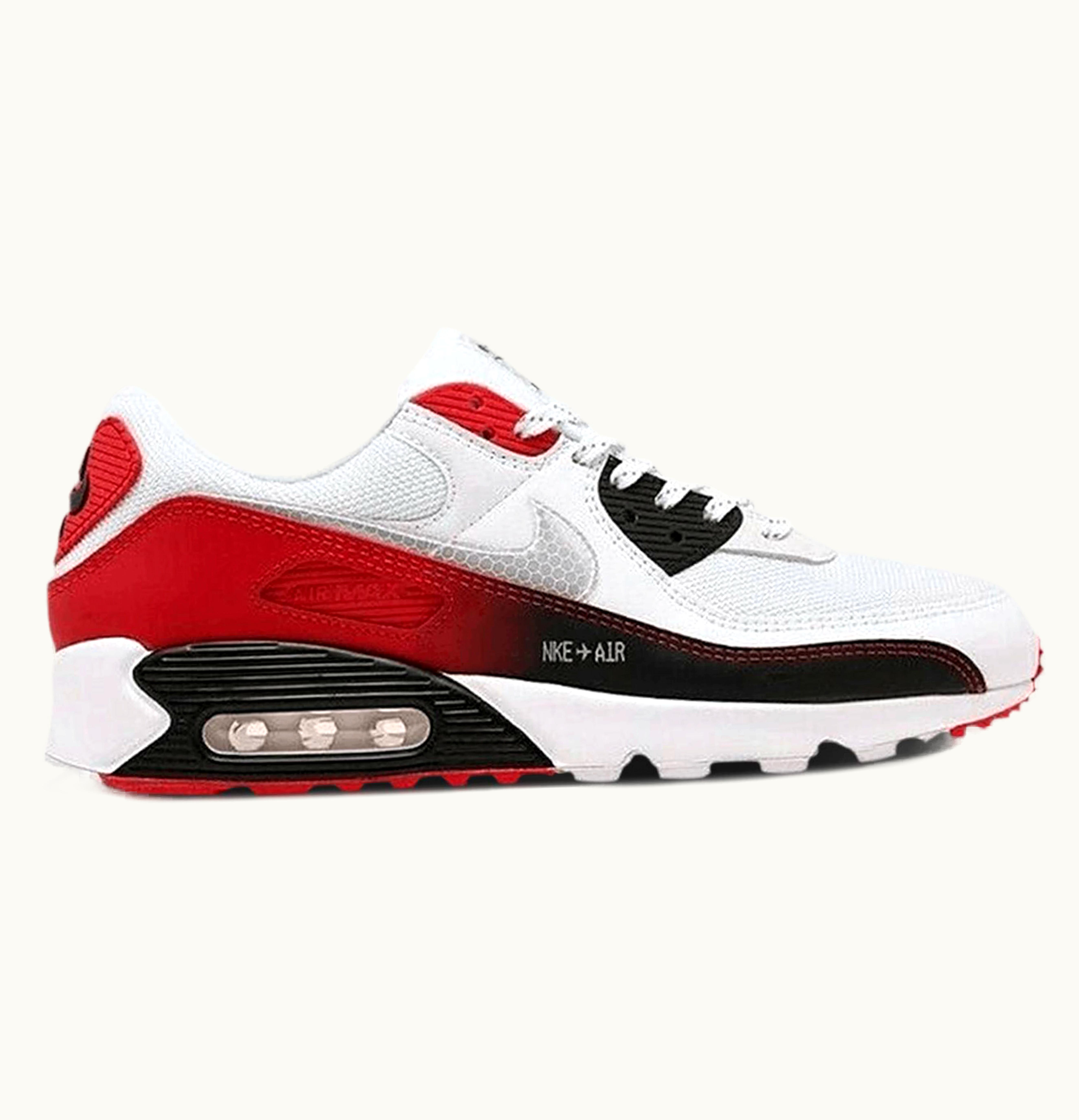 The Nike Air Max 90 White Black Red Gradient sneakers are a modern take on the classic Air Max 90 silhouette. The upper is made of a combination of leather, synthetic leather, and mesh, which provides durability and breathability. The iconic Nike Swoosh is featured on the sides of the sneakers in black, while the white base of the sneaker has a gradient effect that fades from white to gray to black. The heel and sole are in contrasting red, providing a pop of color to the shoe. The Air Max technology in the midsole ensures all-day comfort and support, while the rubber outsole provides traction and durability. These sneakers are perfect for everyday wear or for hitting the gym.